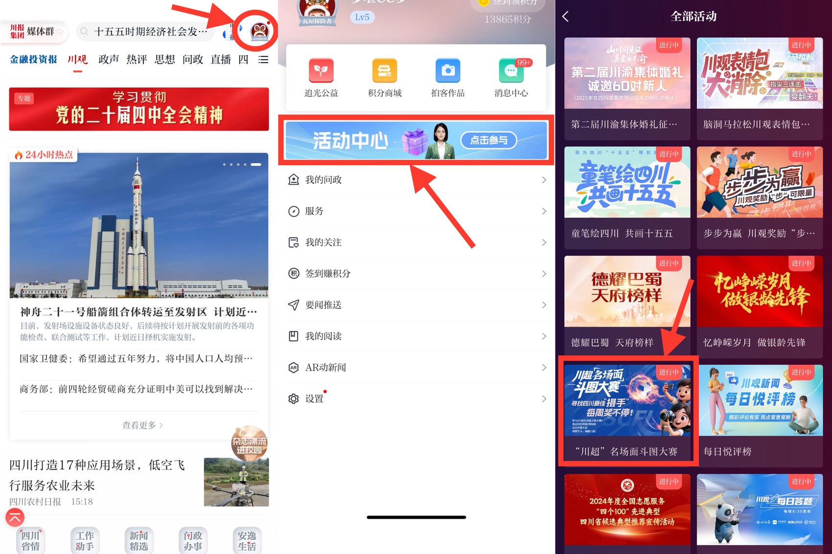 入口二:打开川观新闻App,点击首页右上角头像选择“活动中心”,进入选择“斗图大赛”按钮,点击进入活动。