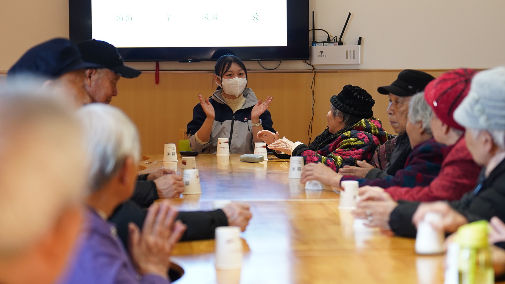 “00后”社工刘露雯组织中心的老年人们一起玩游戏。(胡力文 摄)