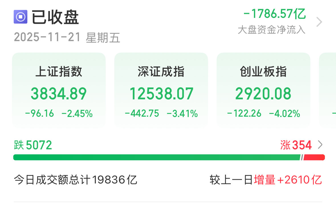 11月21日,A股三大指数集体低开。沪指开盘报3896.66点,随后五分钟内再次站回3900点,但在短暂挣扎后开始下跌,全天持续走弱。截至收盘,上证指数跌2.45%,收报3834.89点;深成指跌3.41%,收报12538.07点;创业板指跌4.02%,收报2920.08点。全市场个股下跌超5000只,仅354只上涨。
