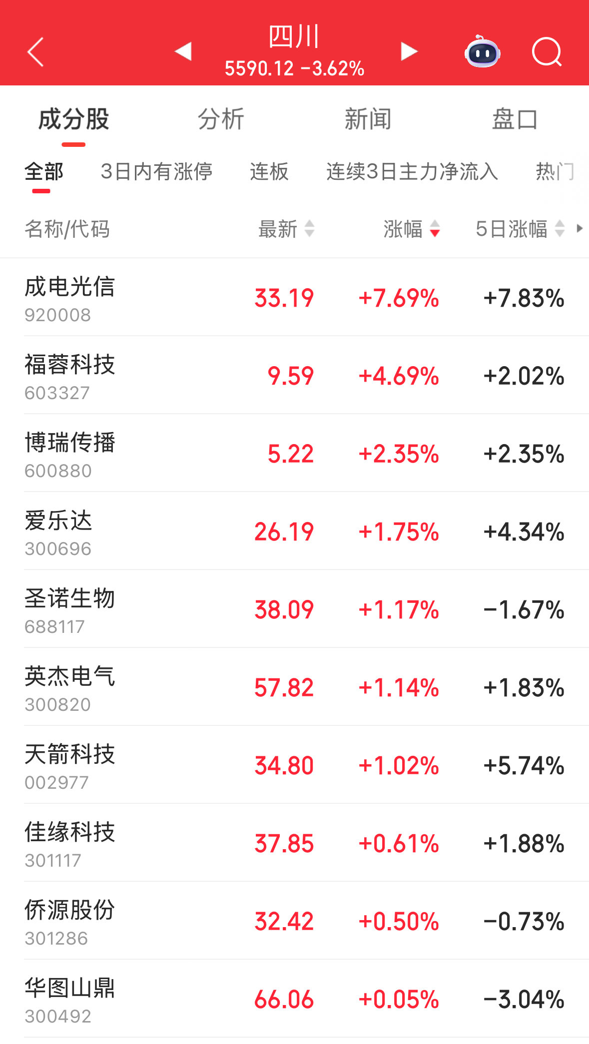 今日四川板块随大盘同步走弱。179只川股中,有10只实现上涨。其中,成电光信、福蓉科技涨幅居前,分别为7.69%、4.69%,其余个股涨幅则较为有限。