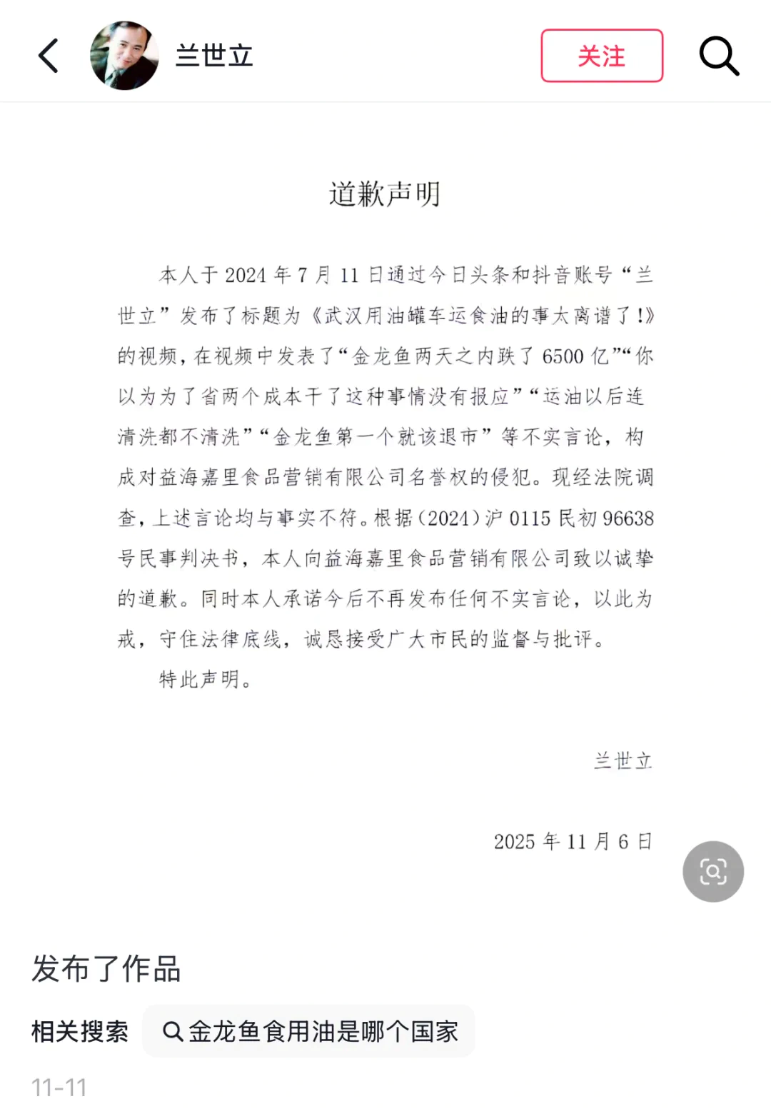 11月11日,兰世立在抖音发布道歉声明,称去年自己曾发表对金龙鱼的不实言论,对益海嘉里食品营销公司(以下简称“益海嘉里”)构成名誉侵犯,向益海嘉里致歉。