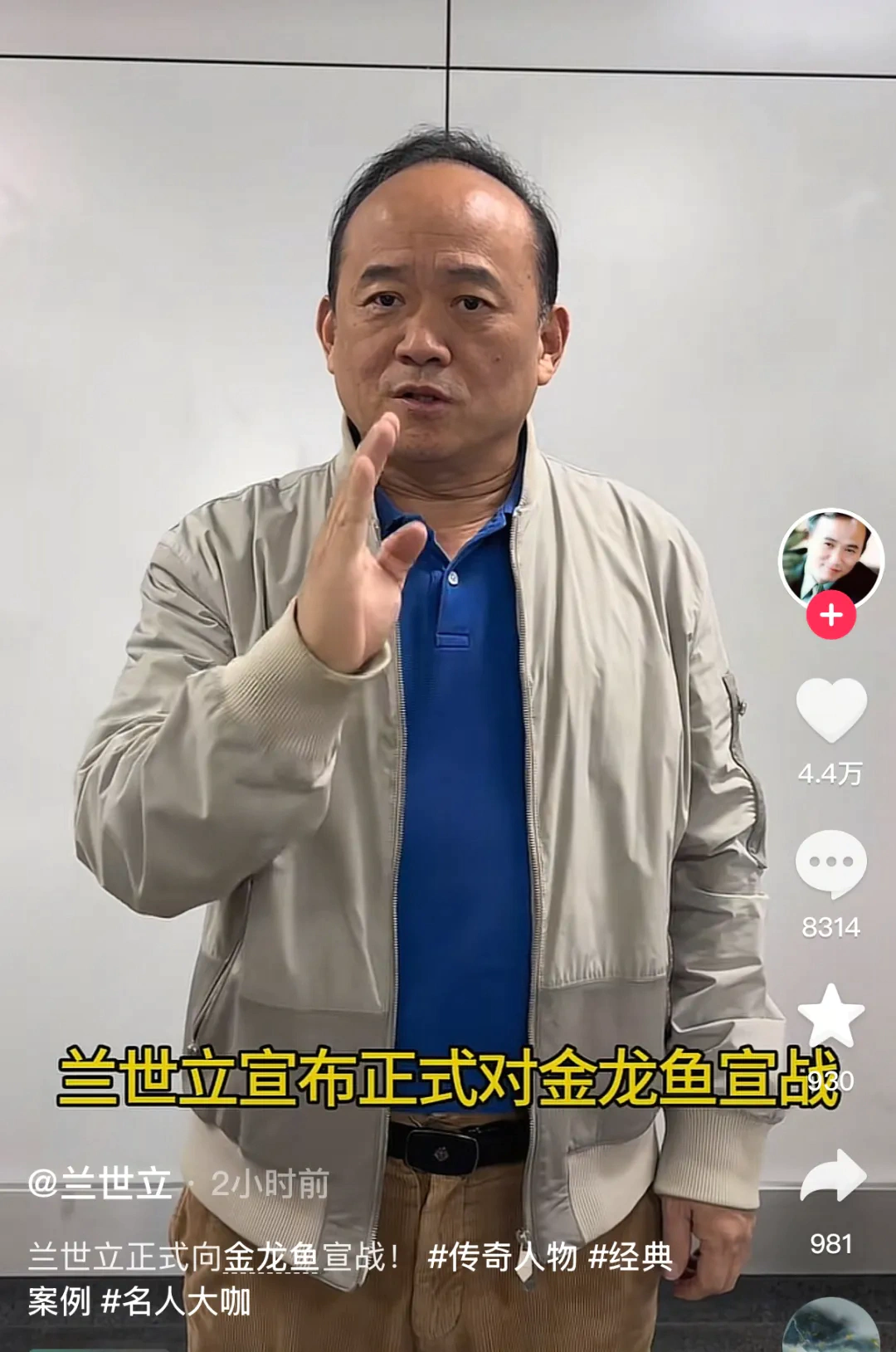 11月20日,湖北前首富兰世立就其与金龙鱼之间的诉讼纠纷,在北京召开《兰世立vs金龙鱼》新闻发布会。次日(11月21日),他又在其抖音账号发布视频,公开表示“正式向金龙鱼宣战”。