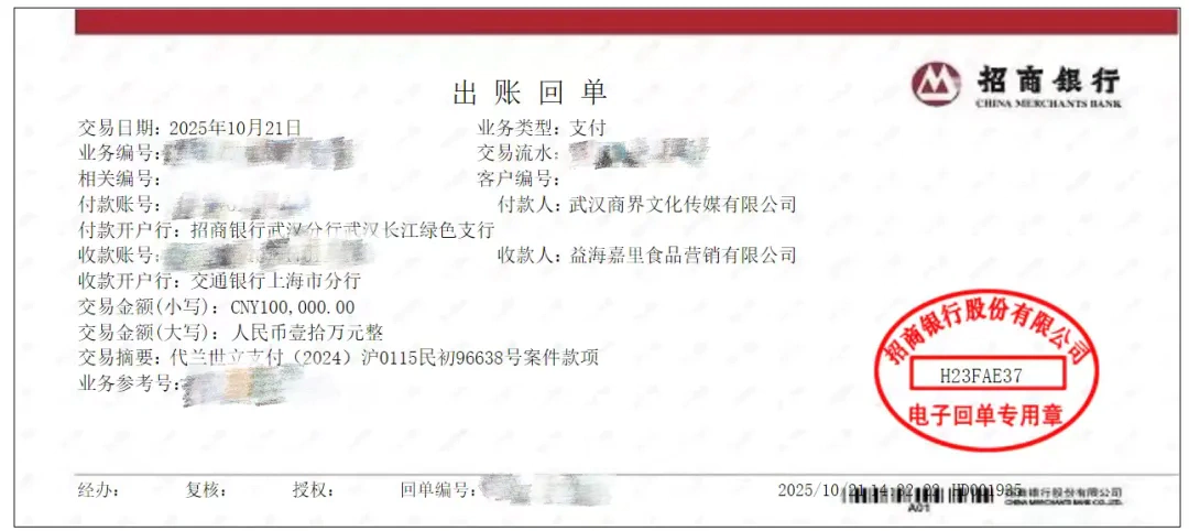 根据兰世立所提供的出账回单显示,付款人武汉商界文化传媒有限公司向益海嘉里食品营销有限公司支付了10万元,并备注“代兰世立支付(2024)沪0115民初96638号案件款项”。