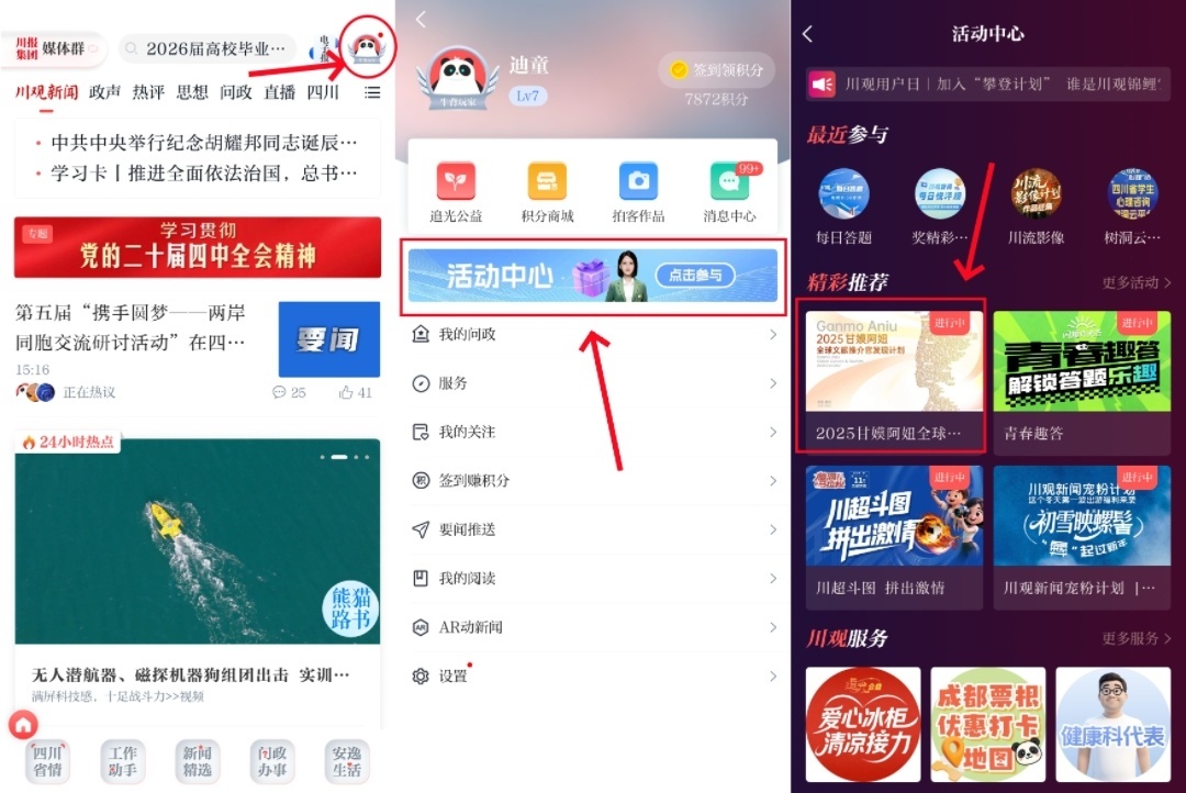 第二步:打开川观新闻App,点击首页右上角头像进入,选择“活动中心”,点击“甘嫫阿妞”活动按钮进入活动,即可参与投票。