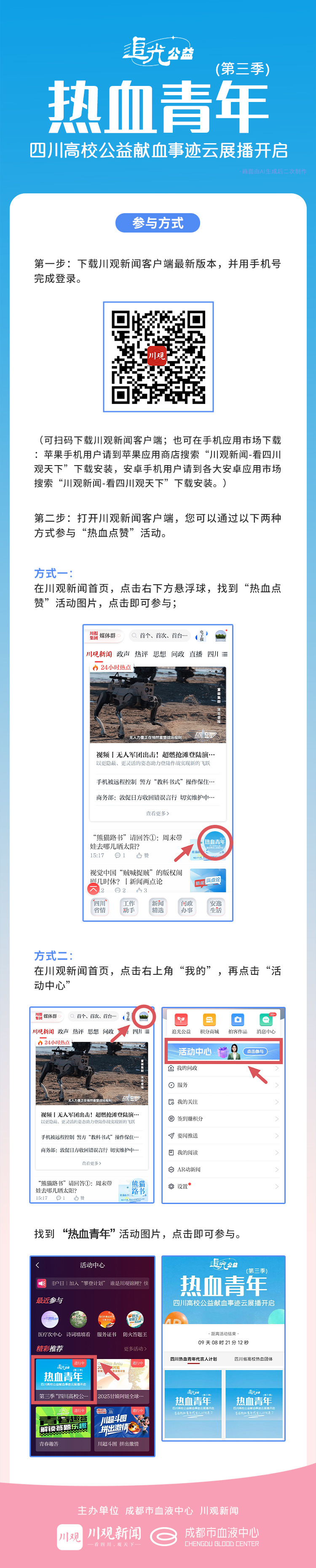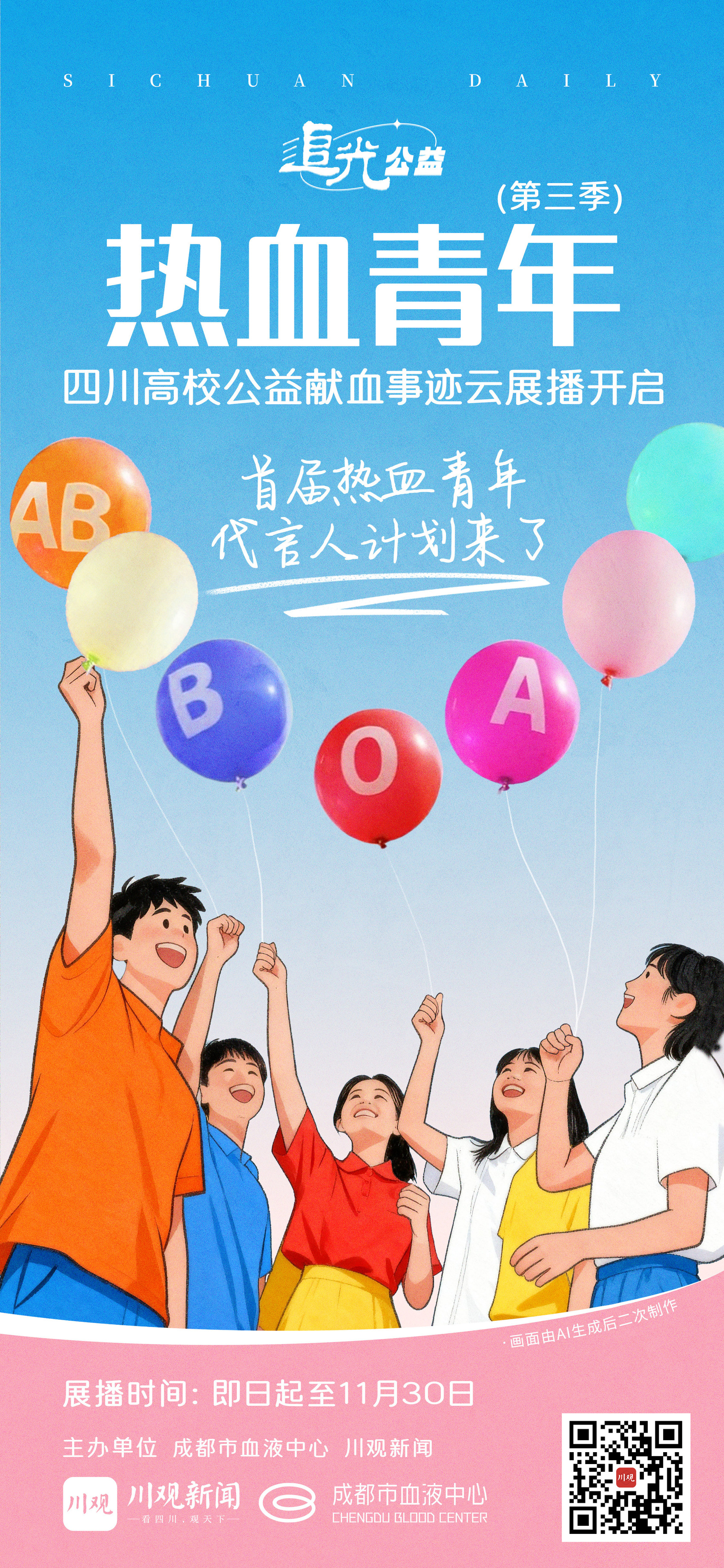 这些高校热血团体的无偿献血事迹正式登陆川观新闻与成都市血液中心新媒体平台,以“组团式”公益云展播的形式精彩呈现;首届“热血青年代言人”候选人也同步亮相,等待着大家的热情点赞。展播结束后,活动将为获奖者颁发官方荣誉证书,更将通过热血事迹宣传,让更多人看见青年一代的善举,感受爱的传递与力量。