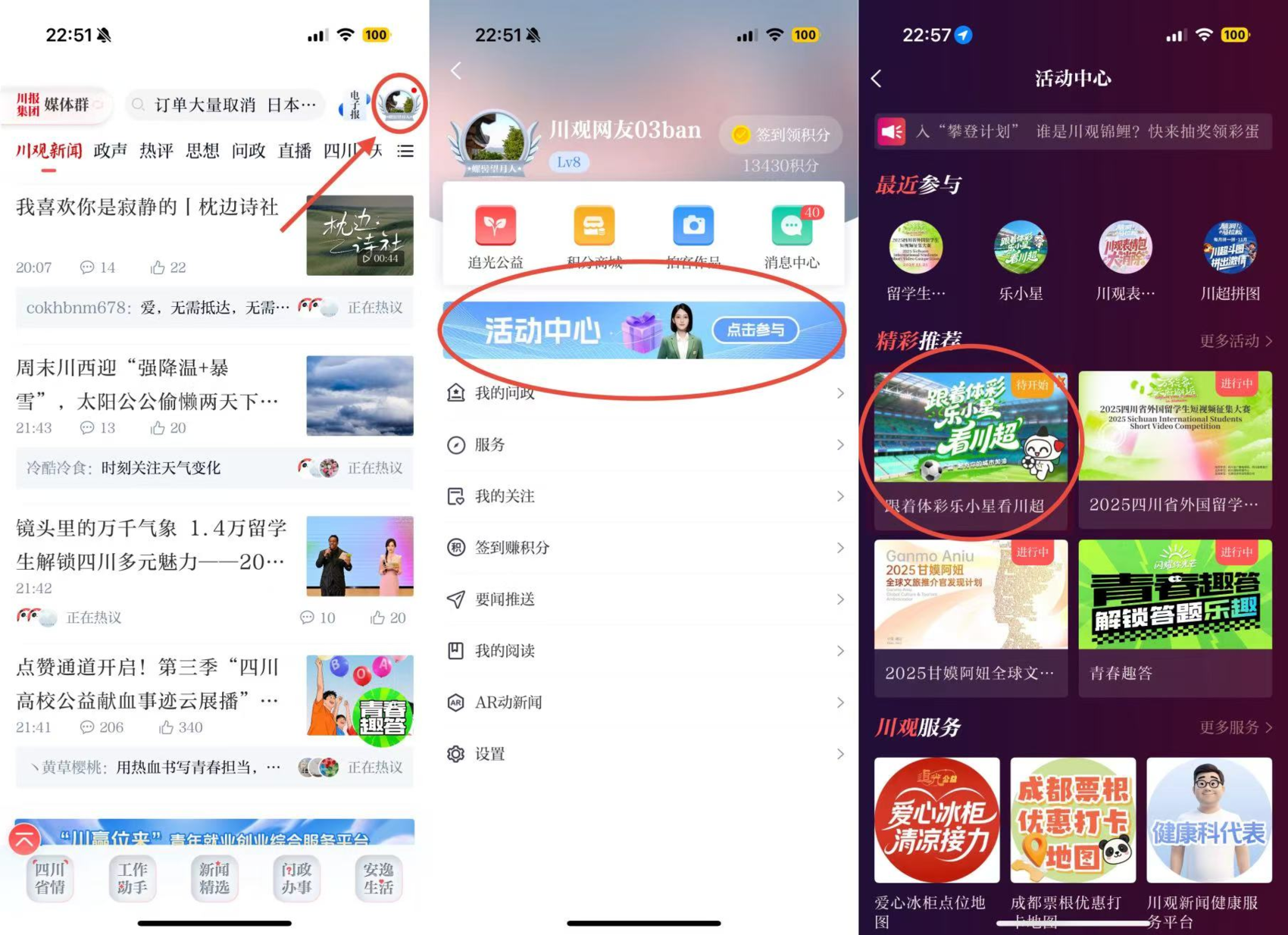 方式二:在川观新闻首页,点击右上角“我的”,点击“活动中心”,找到“跟着体彩乐小星看川超”活动图片,点击即可参与。