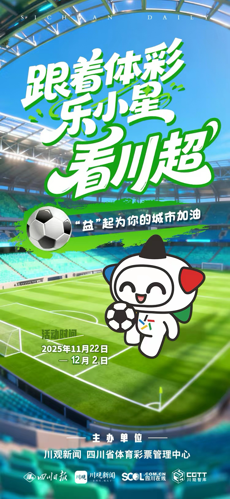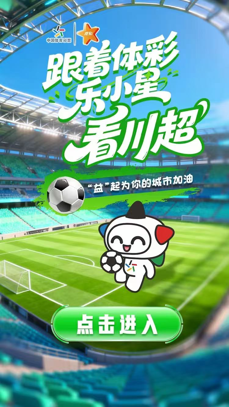 11月22日—12月2日,连续11天,四川省体育彩票管理中心正式推出《跟着体彩乐小星看川超,“益”起为你的城市加油》互动抽奖H5,邀你指尖轻点,参与这场全民足球盛宴,共同点亮四川的公益力量!