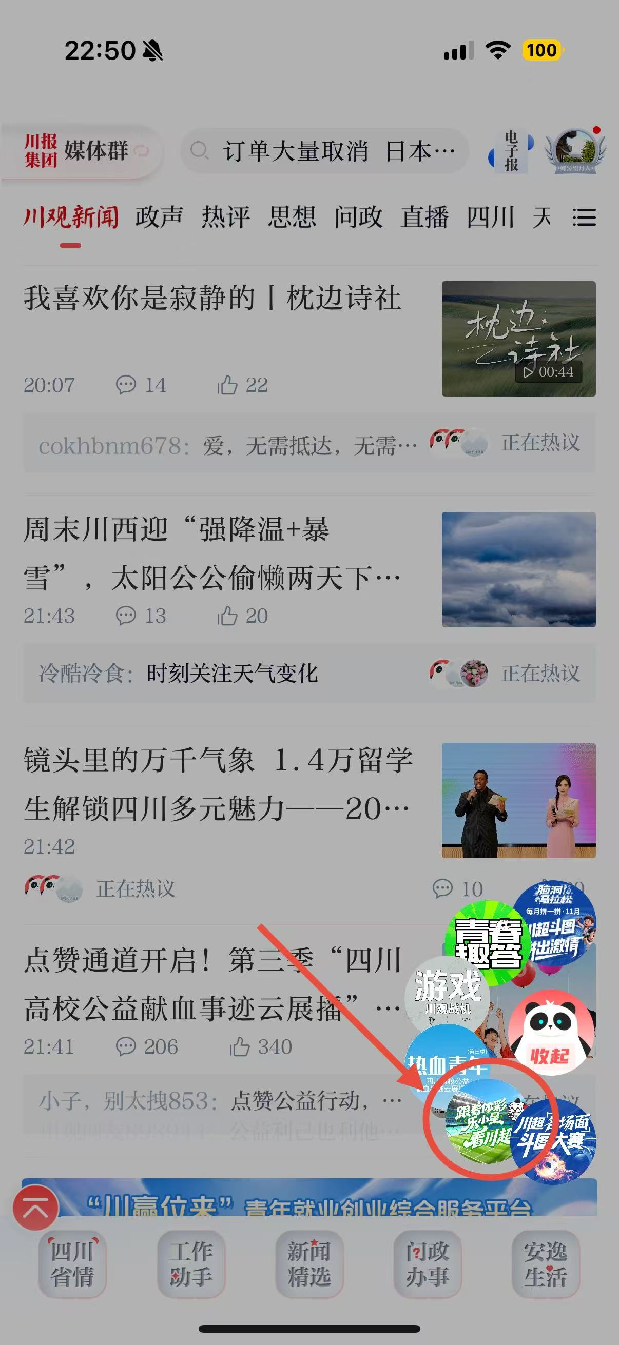 方式三:在川观新闻首页,点击右下方悬浮球,找到“跟着体彩乐小星看川超”活动图片,点击即可参与。