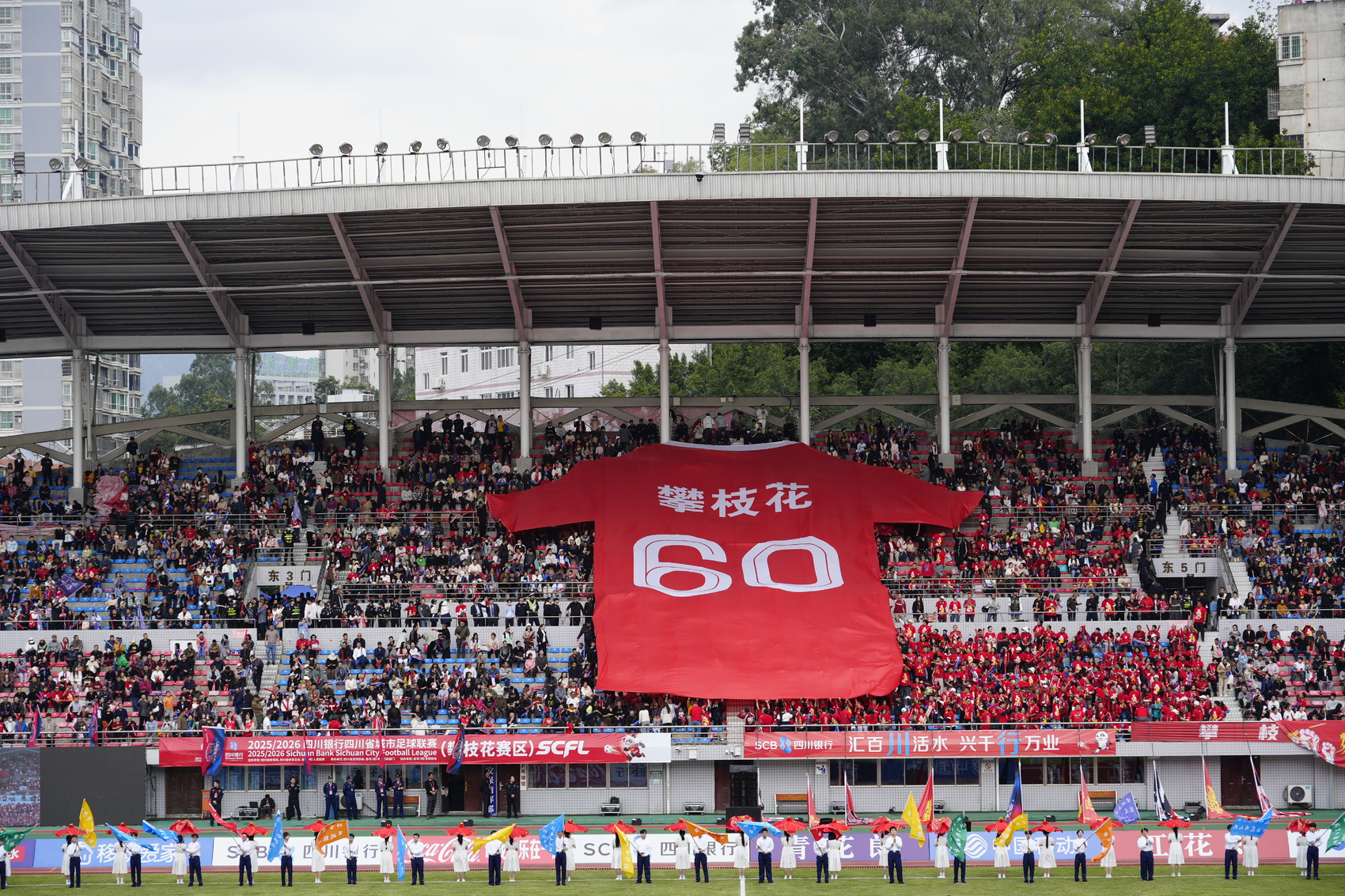 表演尾声,看台上突然展开一面巨型60号球衣,球衣姓名栏清晰印着“攀枝花”三个字,现场气氛瞬间达到高潮。