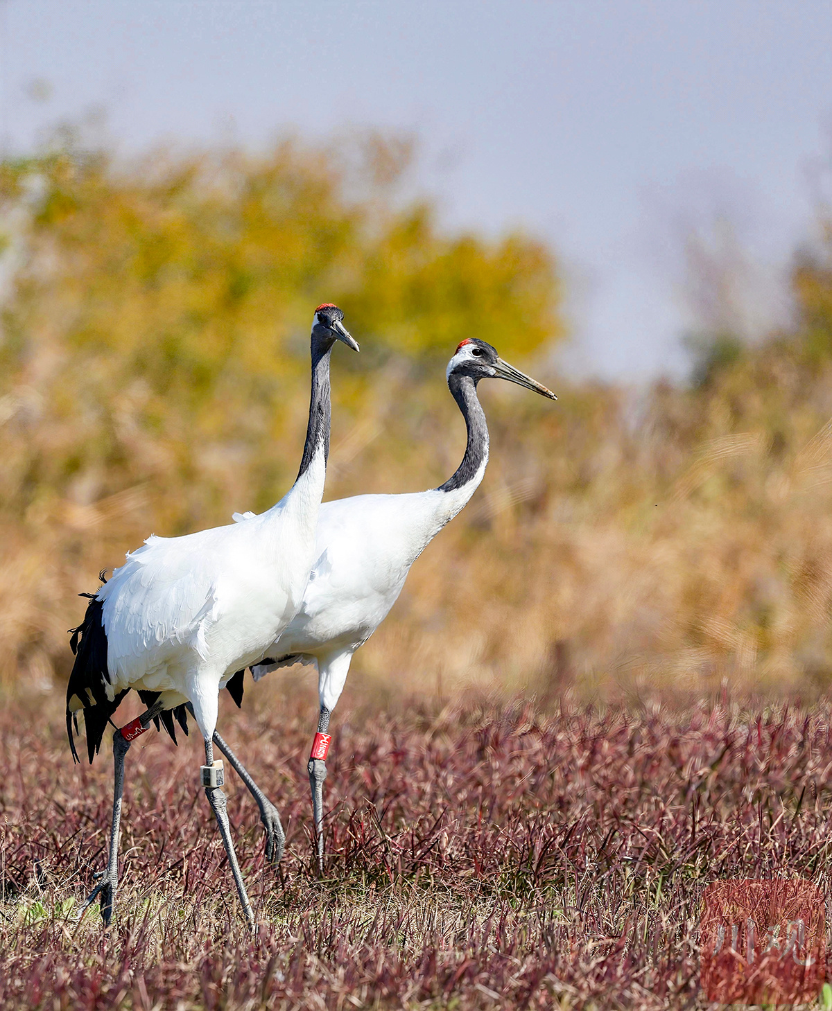 初冬时节,一对丹顶鹤在盐城市丹顶鹤湿地生态旅游区里踱步。