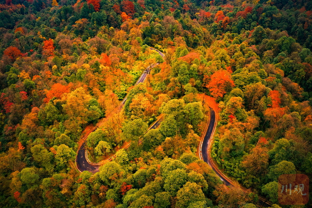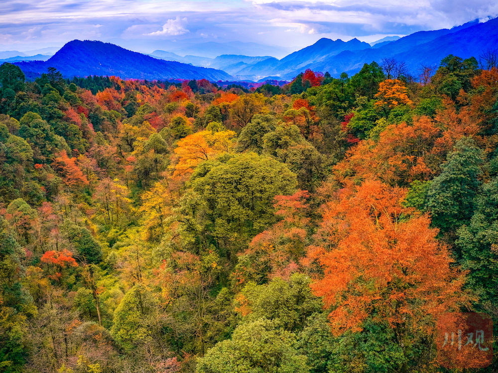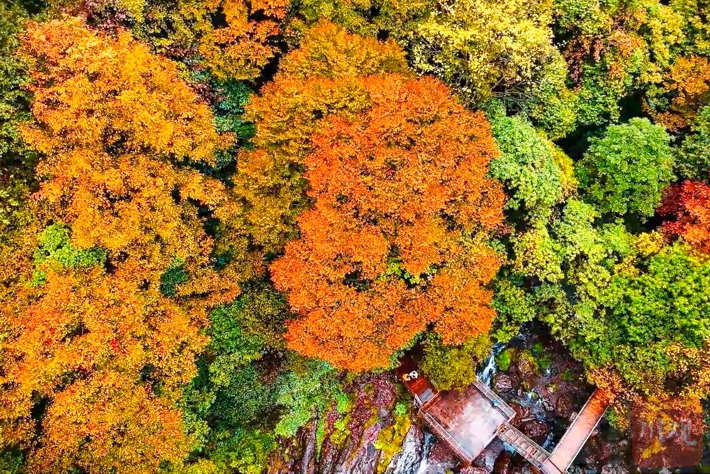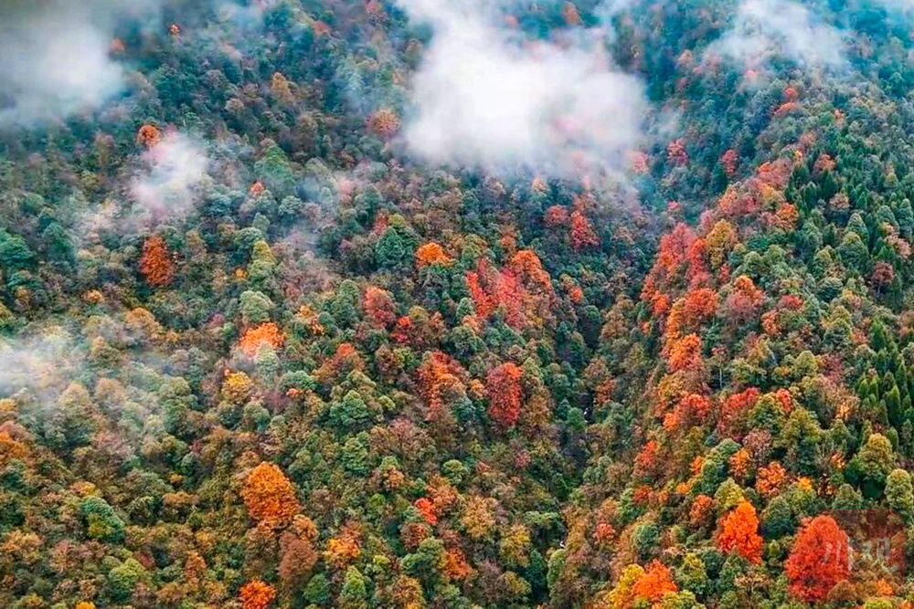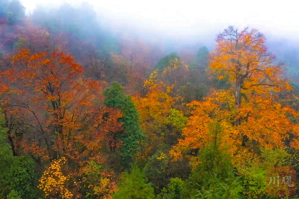 红叶似火、黄叶如金……这段时间,雅安市荥经县龙苍沟国家森林公园内,绯红、橙黄、金褐的彩叶层层叠叠,披上了多彩外衣的山林仿佛正上演一场浓墨重彩的“时装秀”,将深秋初冬的氛围感拉满。