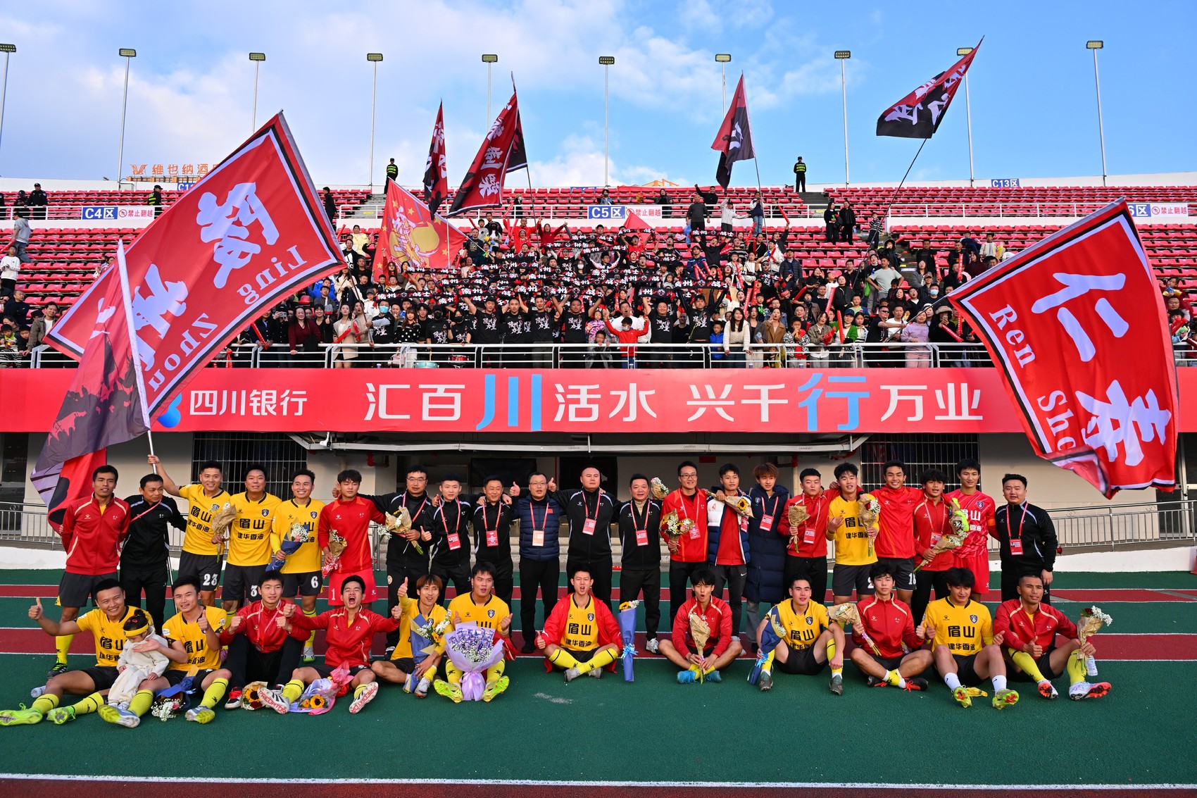 川西赛区第九轮比赛中,眉山射天狼队与球迷合影。
