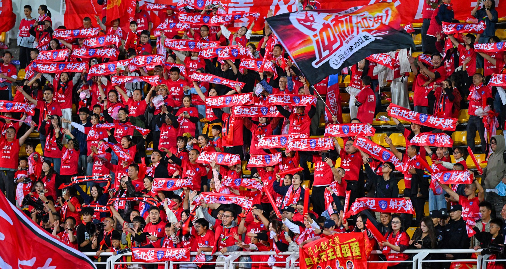 眉山球迷现场为眉山射天狼队呐喊助威。