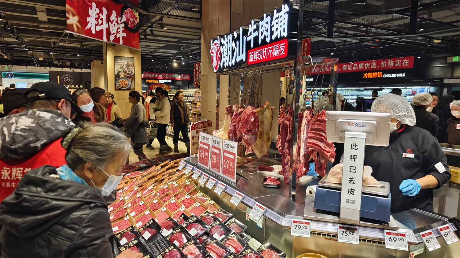 在永辉学习“胖东来模式”过程中,服务力升级也是“重中之重”。安岳中央时代店借鉴胖东来服务模式,肉禽柜台服务延伸至按需提供切丝、切片、绞肉、剥皮及剔骨;海鲜柜台则为高端食材提供专业的清洗、打氧等服务。门店更在细节处彰显人文关怀,增设顾客休息区、便民服务台,配备身高测量仪、血压计、洗手池、直饮水与微波炉等设施,休息区提供的免费热茶就有5种之多,构建更具温度的服务场景。