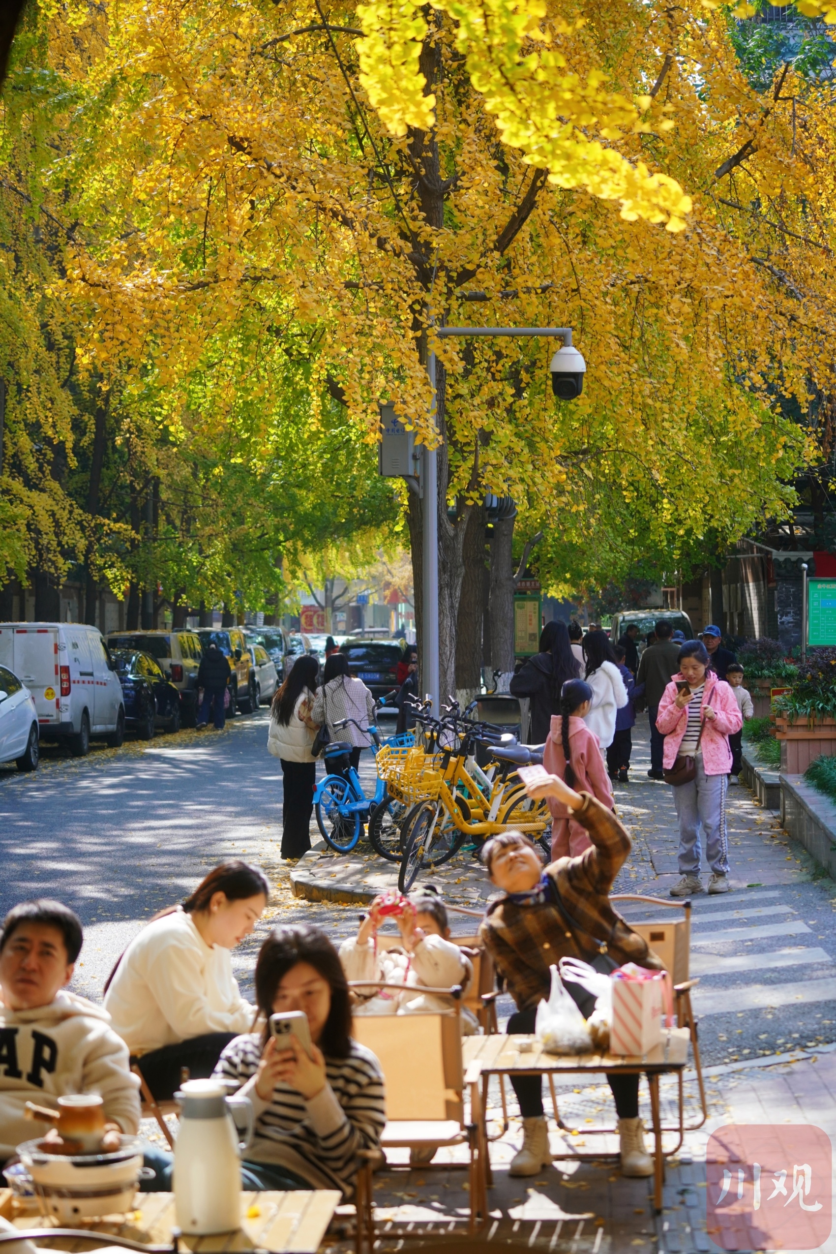 市民坐在街边欣赏秋冬限定金黄银杏