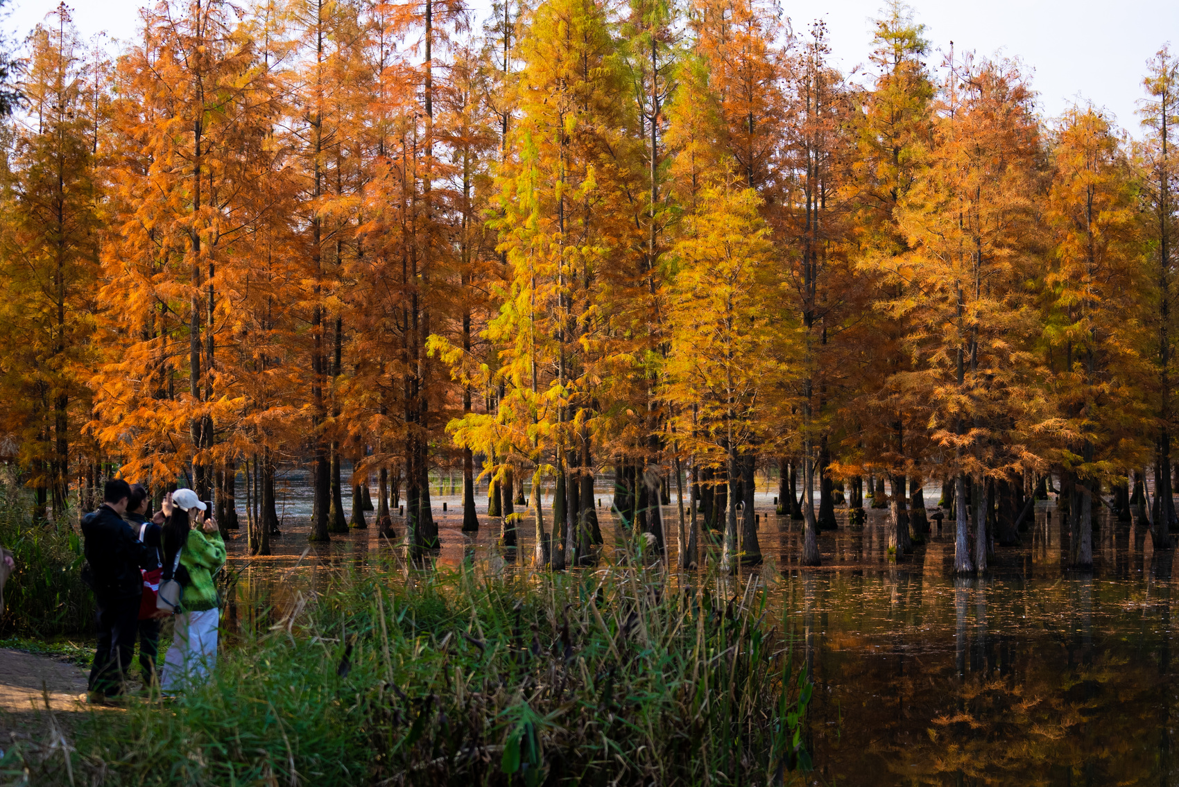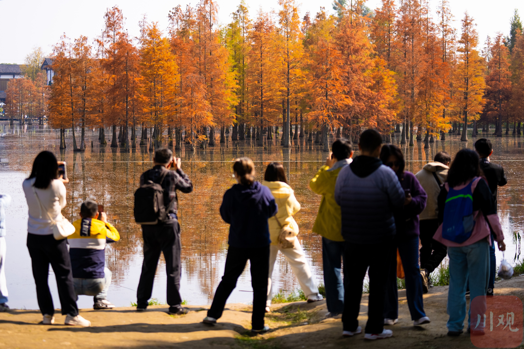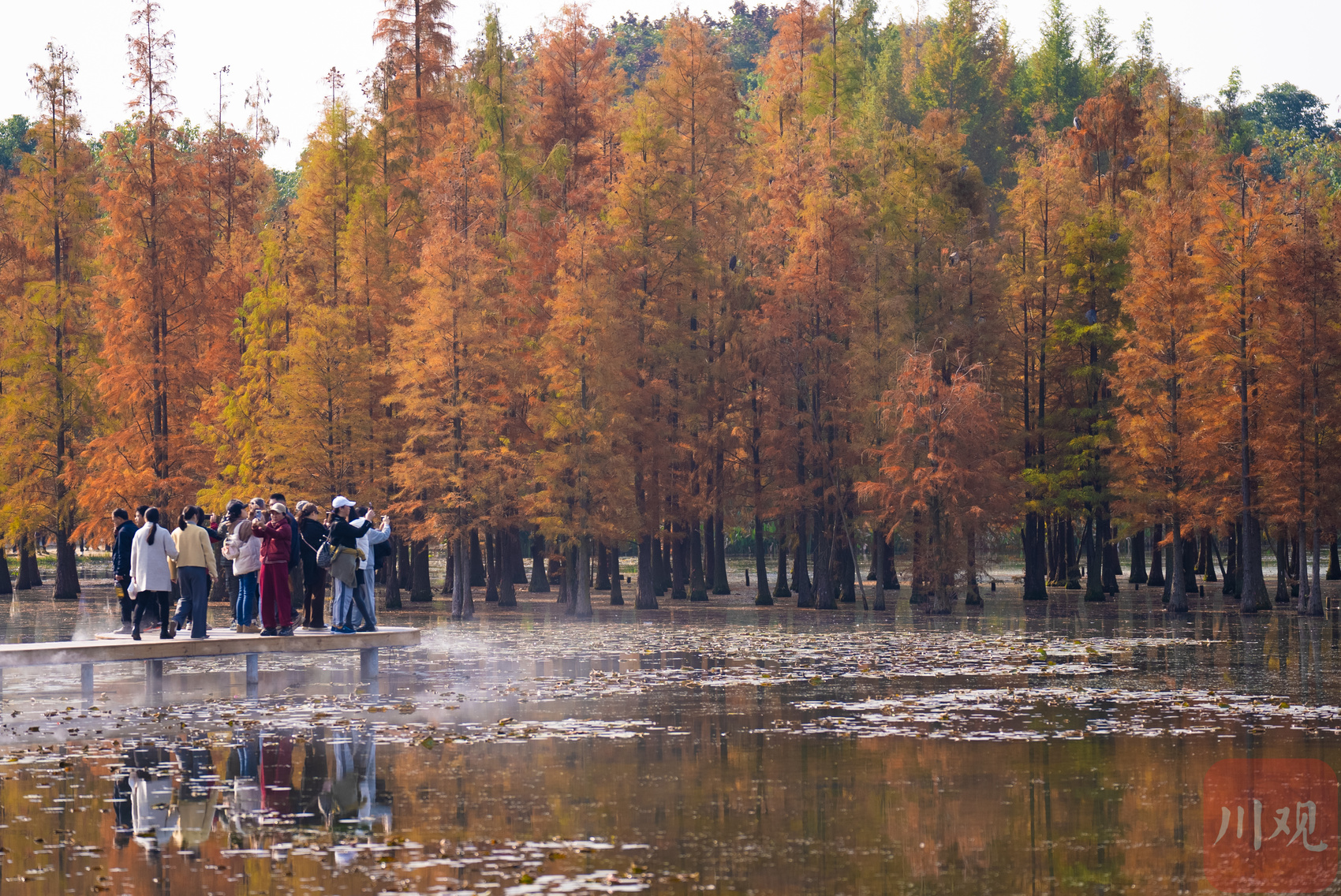 市民和游客在拍摄已经全红的水杉林。