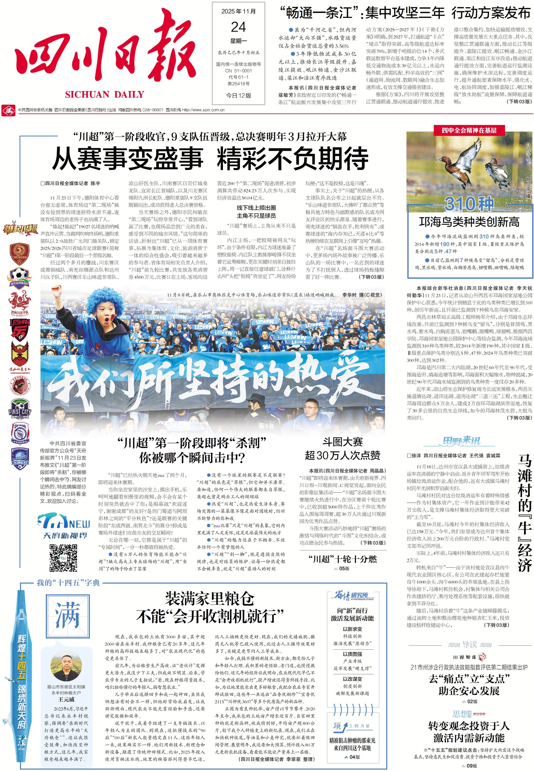 随着德阳体育中心的终场哨声响起,“川超”第一阶段昨日正式收官,德阳重装、成都锦城等9支队伍成功晋级总决赛。两个多月间,“川超”热梗不断,线下线上频频“出圈”,售票系统几次被“挤爆”,线上观看人次超1亿,全网传播量破百亿。各地借机纷纷出招,将“足球流量”变为“城市活力”,串起了文旅消费的链条。今日1版,一起进入“川超”的“专属时间”。