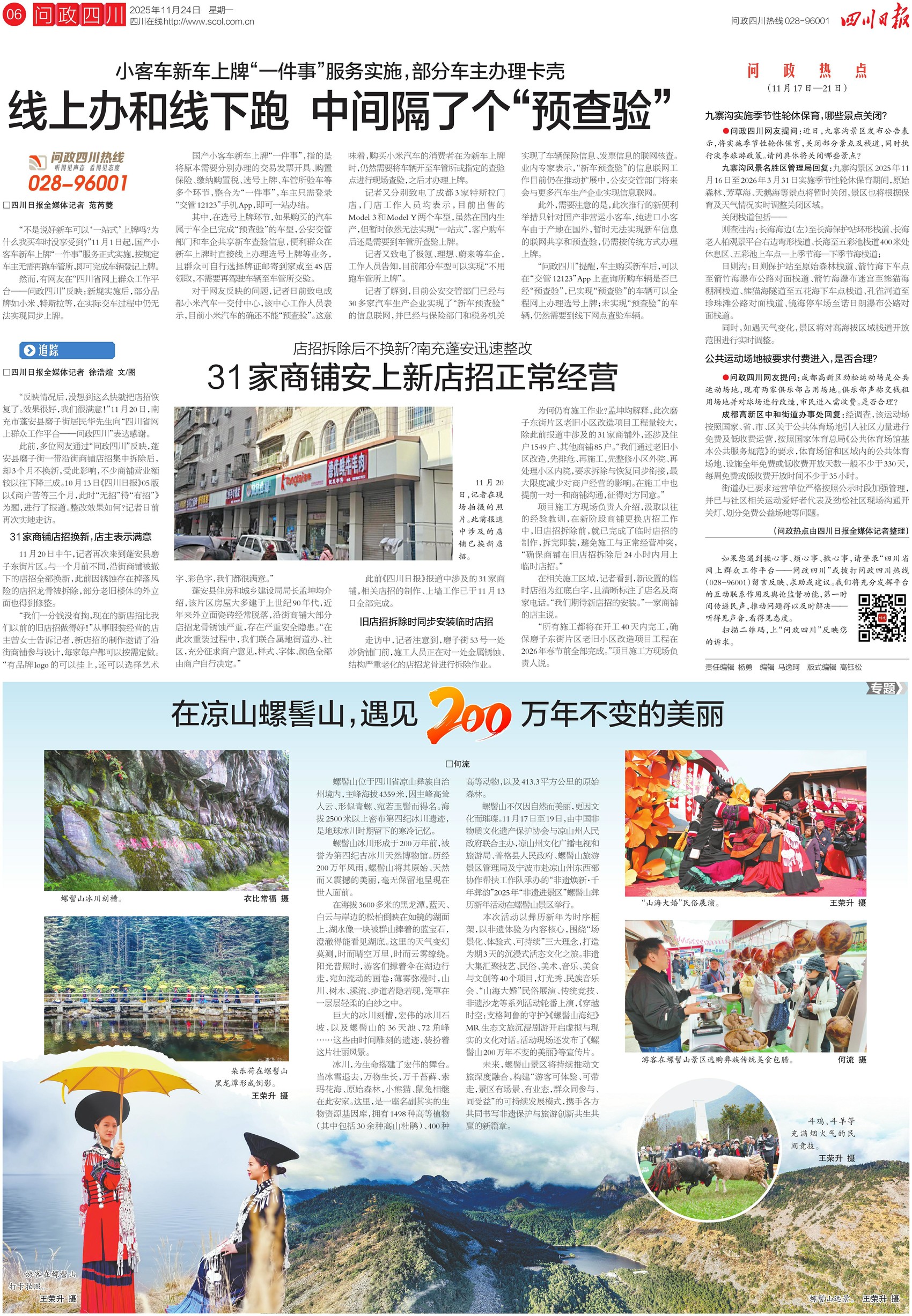 四川国产小客车新车上牌“一件事”服务上线啦!当大家开始在家躺着上牌时,小米等品牌的部分车主却发现享受不到这项服务。原因竟是卡在了“预查验”这环——只有车企提前完成“预查验”等工作的车型,才能在“交管12123”App办理上牌。目前有30多家车企实现信息联网,但部分品牌车型暂时还没完成这项工作,所以车主只好乖乖线下跑一趟。想知道自己用不用跑车管所?今日6版,来看如何查询车辆“预查验”状态。