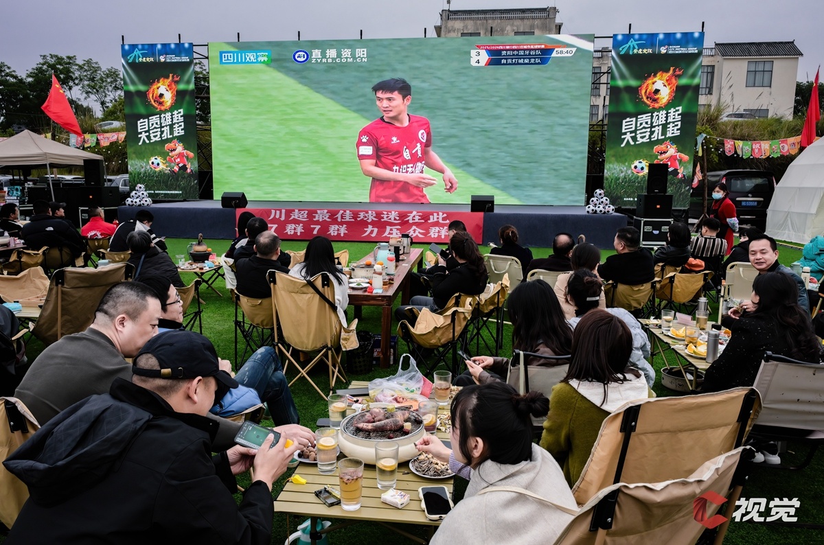 11月16日,自贡市大安区青龙湖房车营地设置“川超”第二观赛点,市民与球迷围炉煮茶,通过大屏共同观赛。