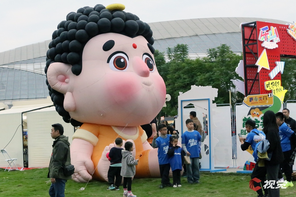 11月8日,乐山味道非常队主场迎战眉山射天狼队。场外美食打卡区人气十足,不少球迷与乐山大佛玩偶合影留念。