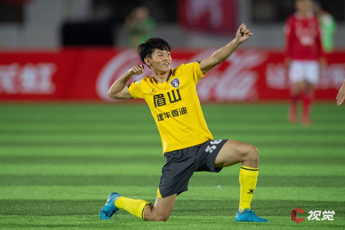 10月19日,眉山射天狼队以1∶0战胜攀枝花攀钢钢铁勇士队。36号球员卢梓瀚进球后,兴奋地向看台比出“射天狼”专属手势。