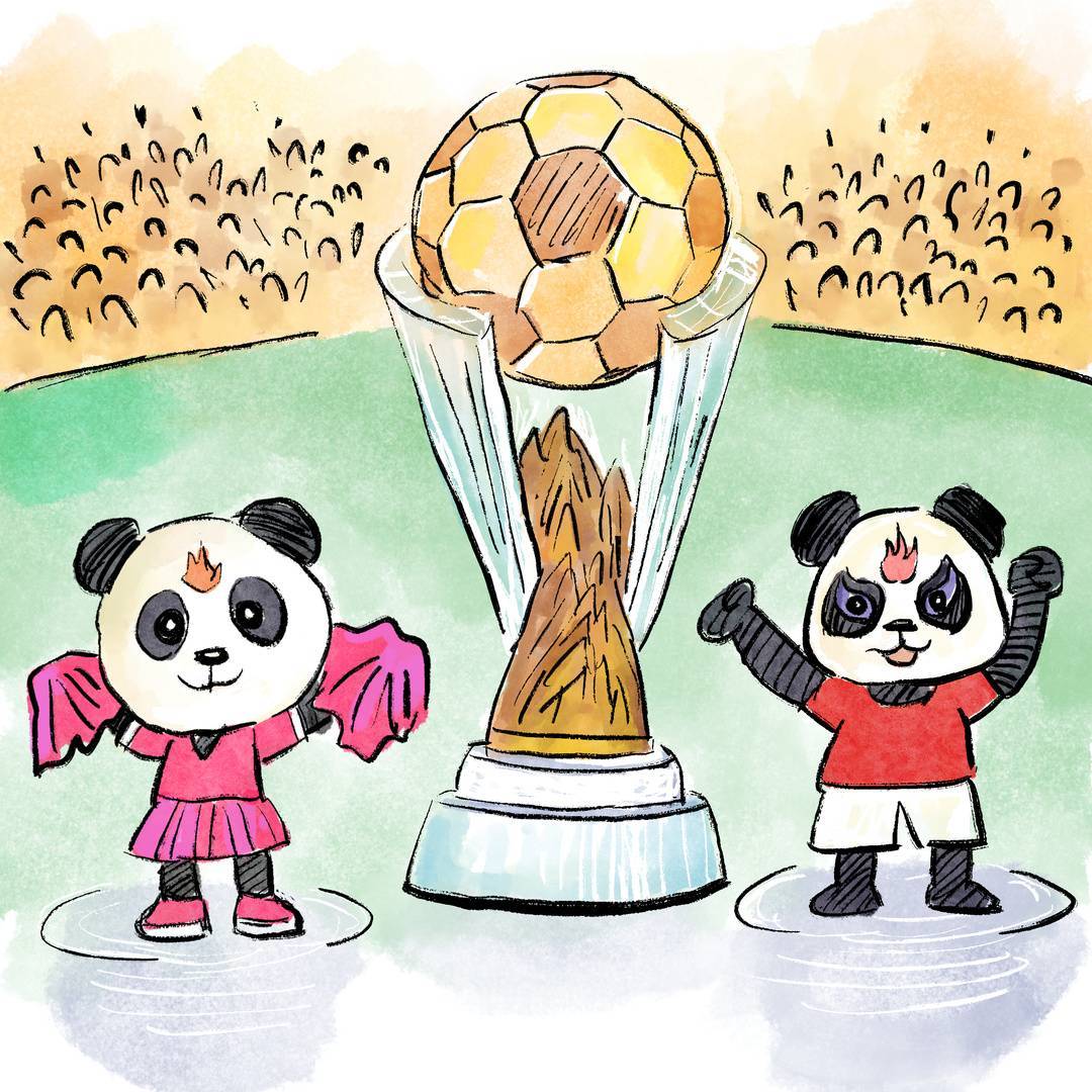 本次“川超”主题LOGO将足球、熊猫、“川”字、辣椒、川剧变脸和火焰等符号创造性结合,突出川味特色与竞技精神。吉祥物“超哥”与“超妹”以四川最具国际影响力的名片──大熊猫为原型,命名源自“川超”二字,并以“哥”“妹”这样富有四川亲切感的称谓拉近与公众的距离。联赛奖杯设计以金色足球为核心造型,结合水晶与山峰意象,象征“勇于攀登、问鼎巅峰”的体育精神。奖牌则以成都市花芙蓉为底,融入古蜀太阳神鸟金饰纹样与熊猫图案,三大文化符号交汇,突出地域标识。