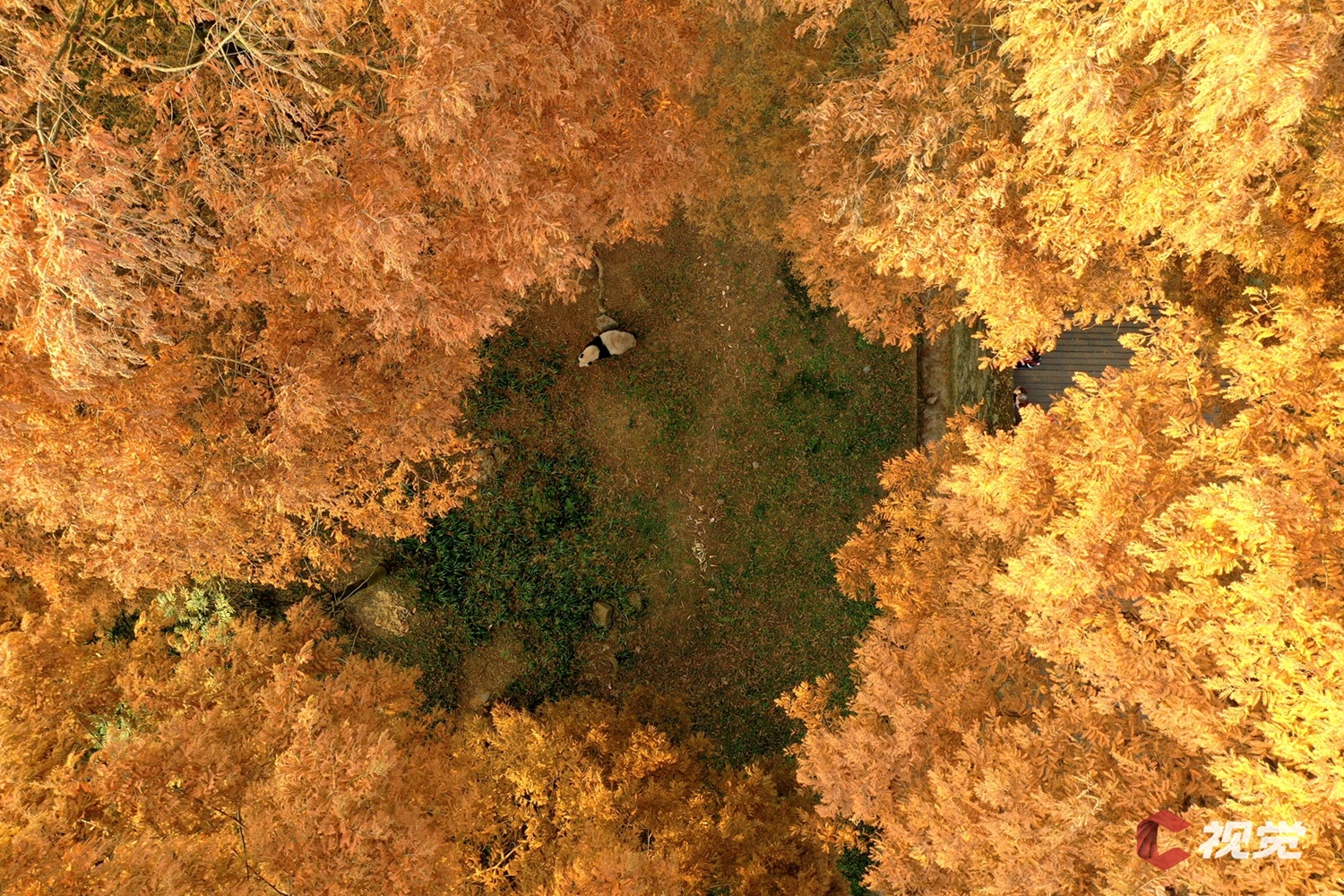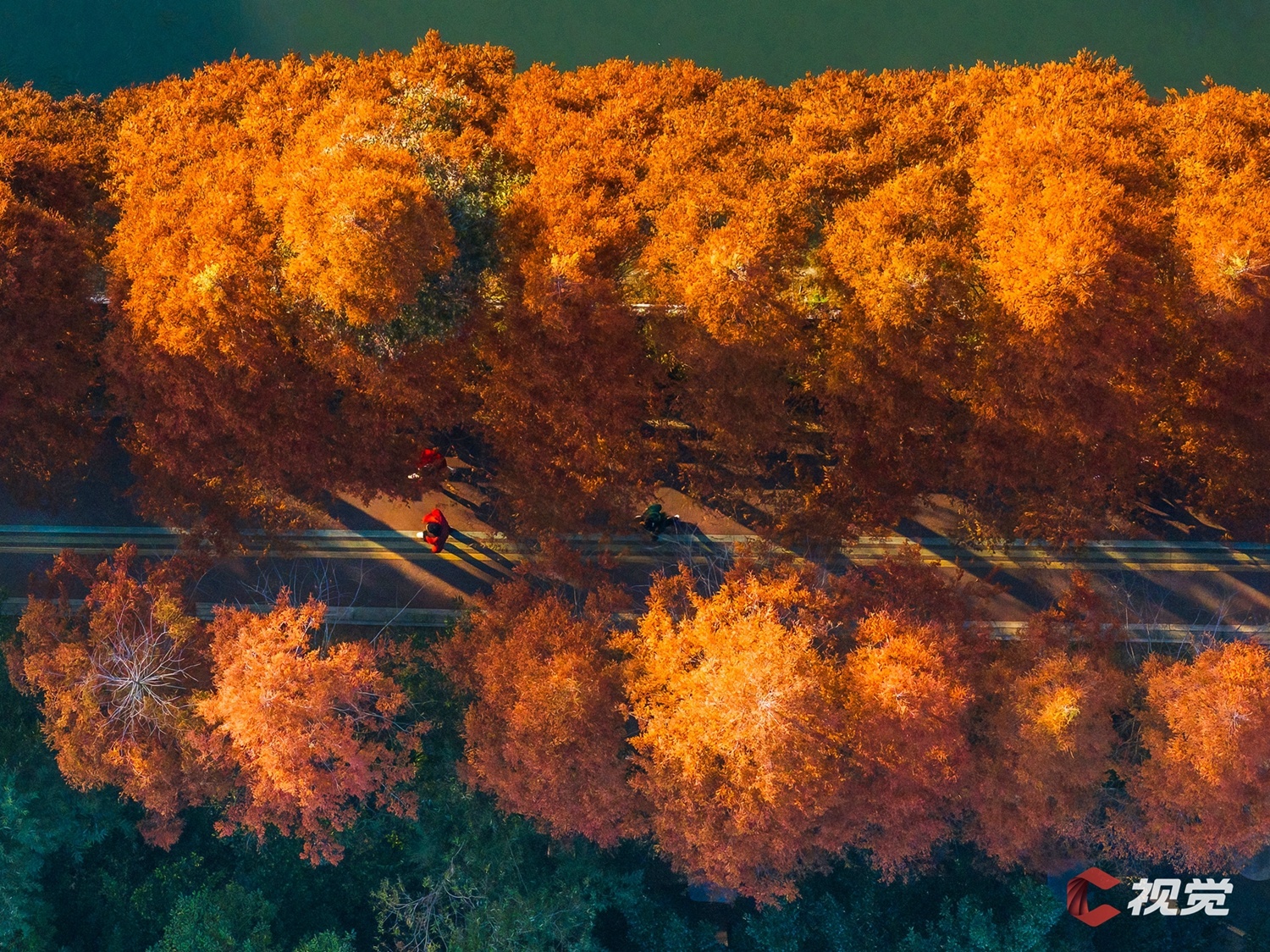 成都市郫都区蜀绣公园内的水杉披上金红“外衣”,风景如画。