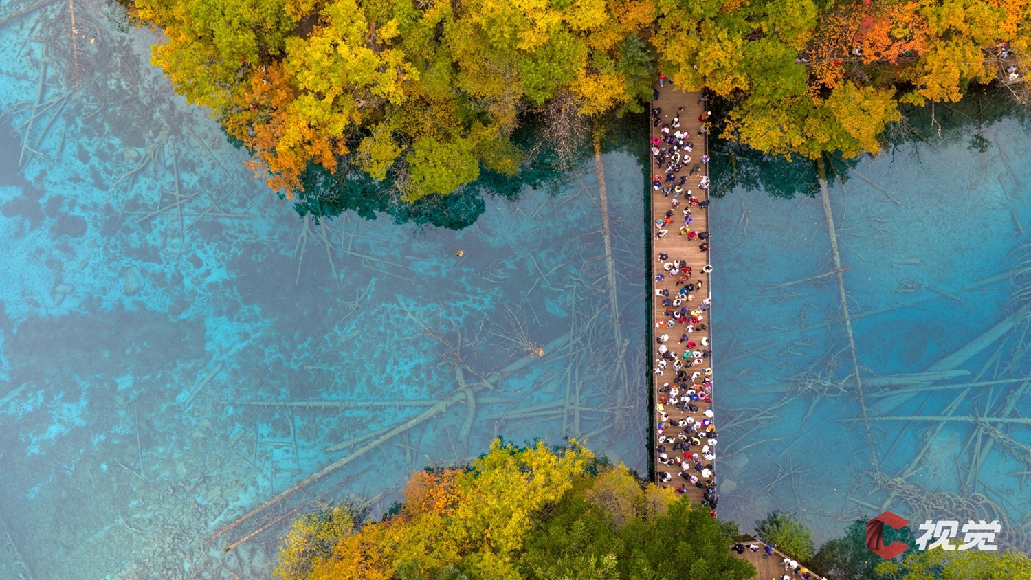 阿坝州九寨沟景区彩林迎来最佳观赏期,众多游客在五花海赏景拍照。