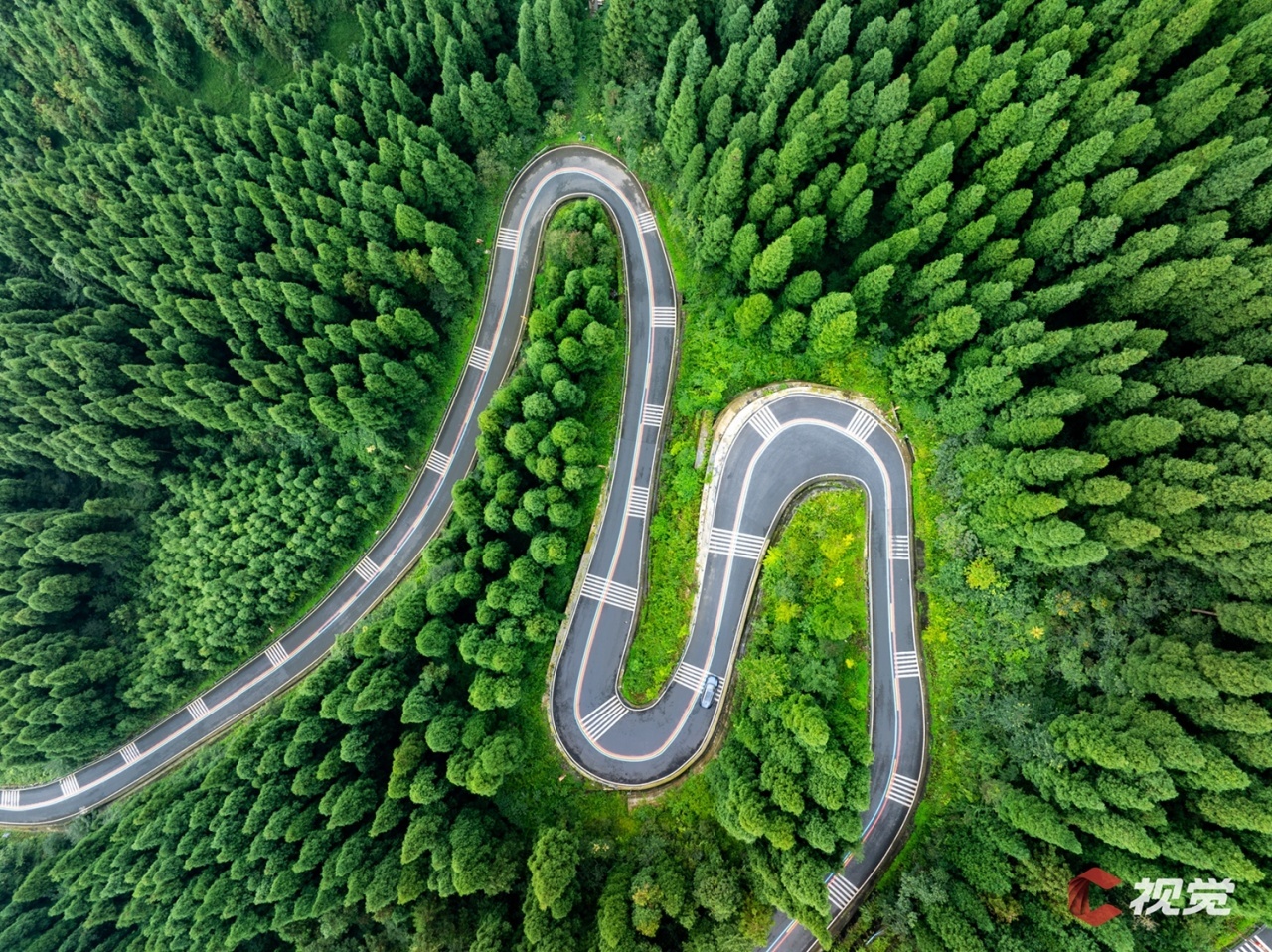俯瞰大熊猫国家公园什邡管理总站内的蓥钟公路在林间蜿蜒盘旋。