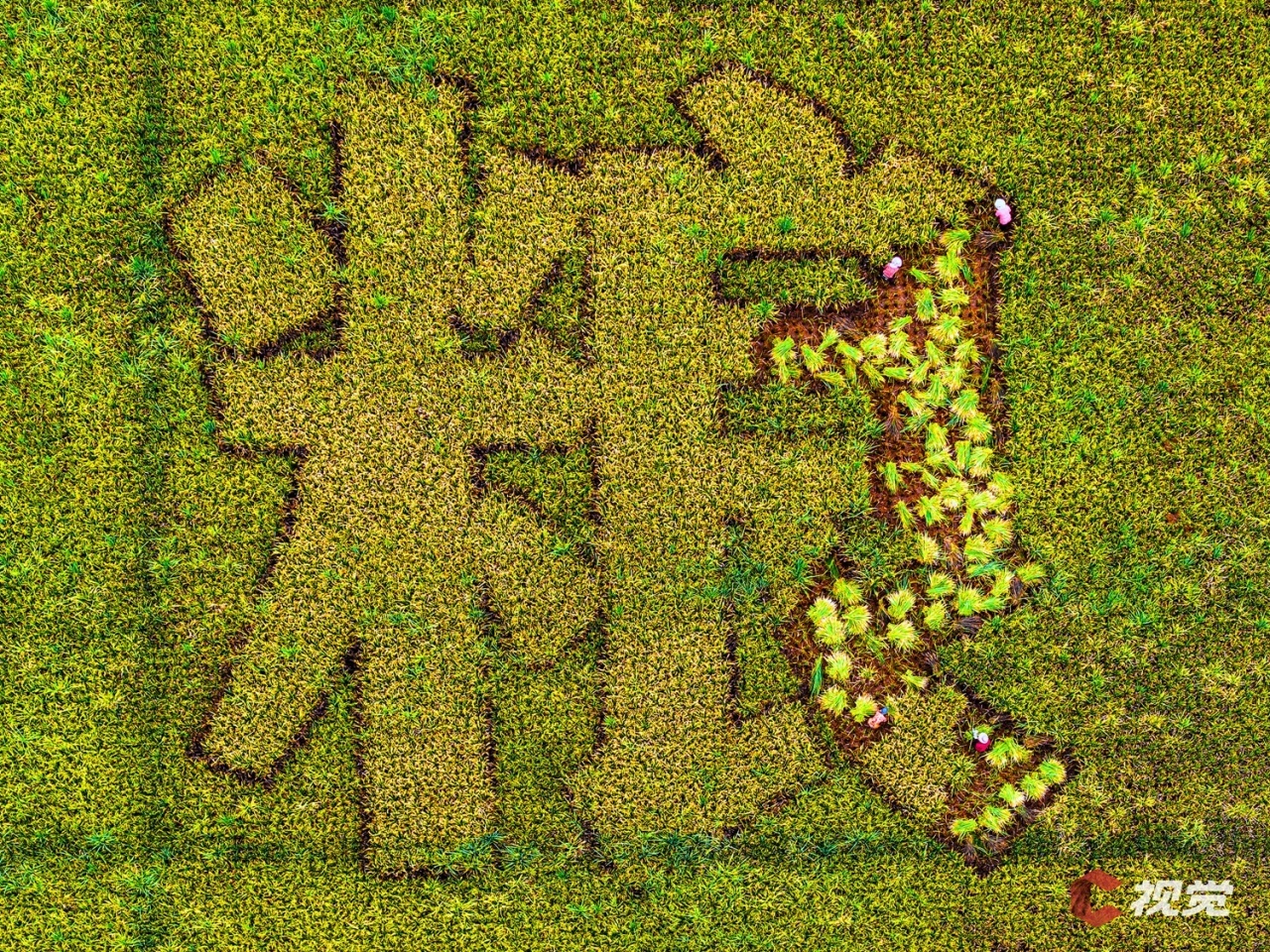 宜宾市南溪区全福村的村民收割“粮“字里的水稻。近年来,稻田字画己成为农村生产新风尚。
