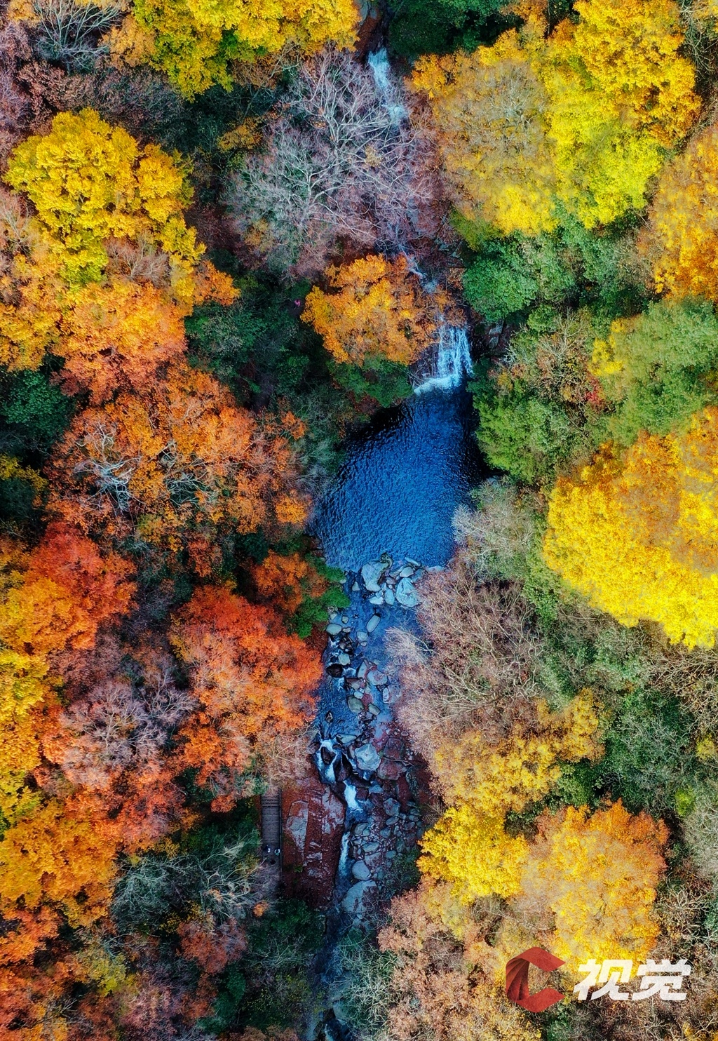 巴中市南江县光雾山十八月潭景区,绚烂的红叶簇拥着深蓝的水潭,好似一幅浓墨重彩的油画。