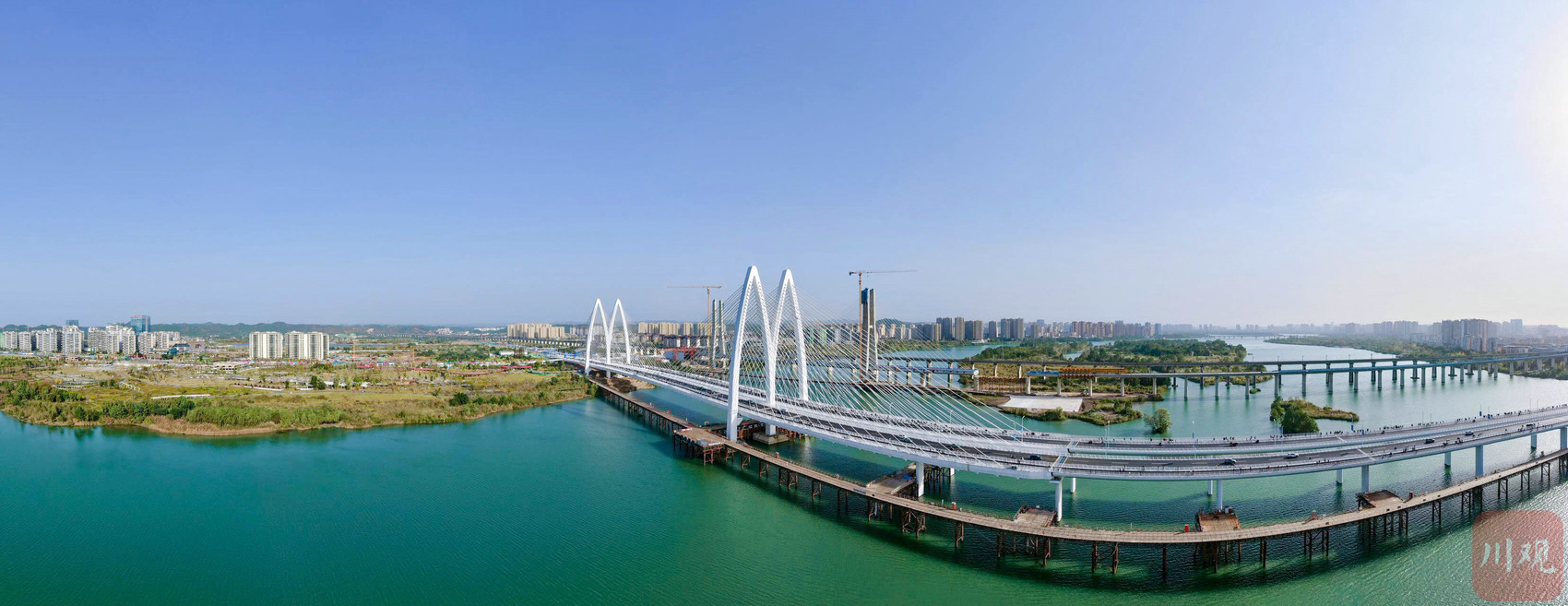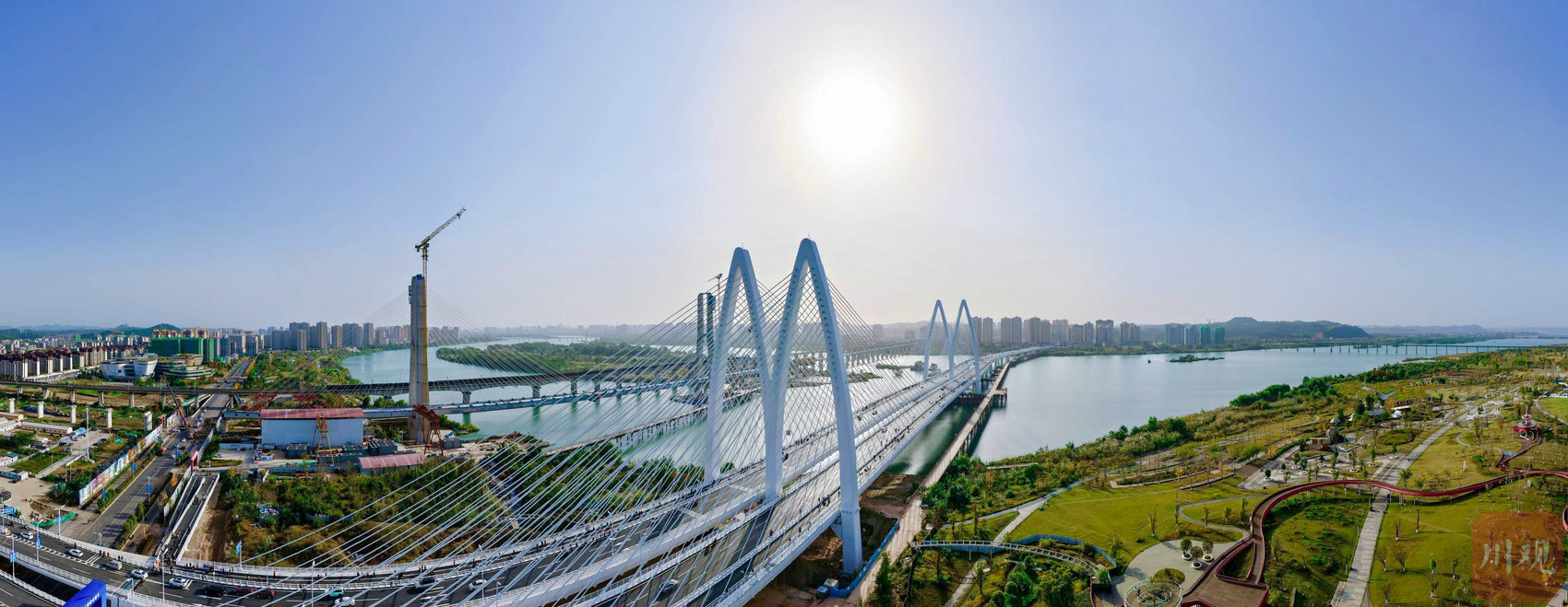 涪江六桥是遂宁首座双塔五跨混凝土梁斜拉桥,主跨338米,总长3.215公里,设计时速60公里,双向六车道,配套非机动车道及人行道。