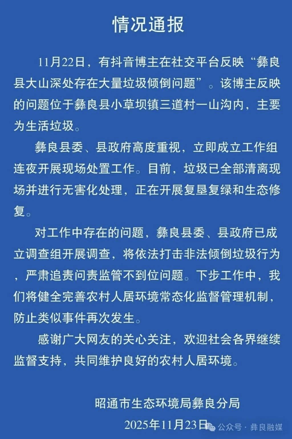 视频曝光后,引发各级政府职能部门高度重视。23日,昭通市生态环境局彝良分局发布官方通报,称已成立调查组展开调查。