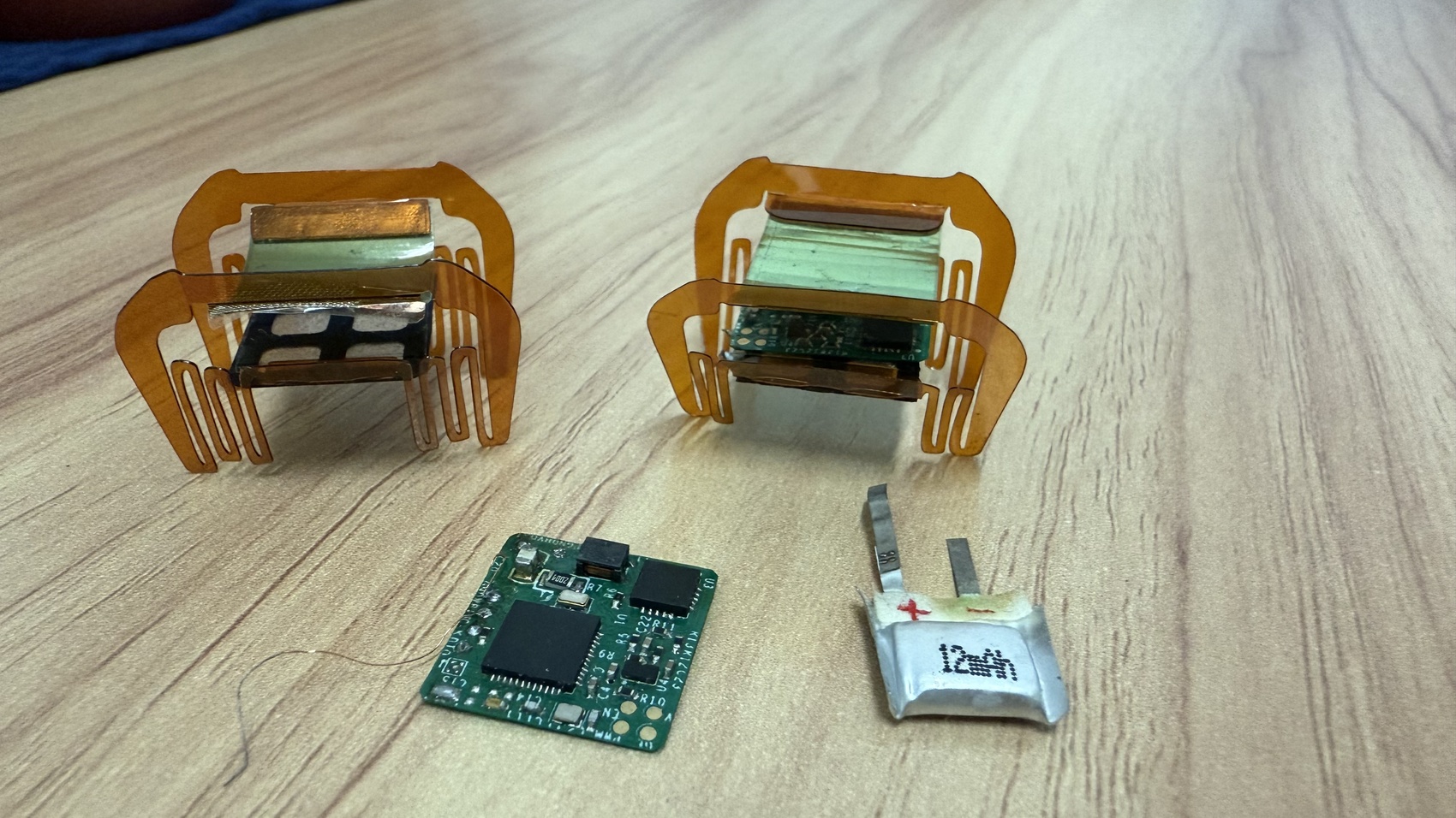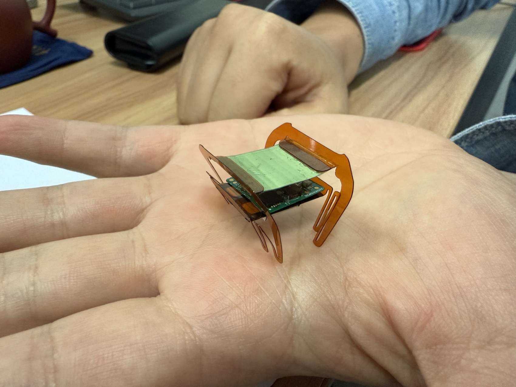 在这片薄薄的“人工肌肉”之下,集成了电池、控制电路与传感器等关键部件,它们通过直径仅头发丝四分之一的细线与之相连。只需通过手机蓝牙向电路板发送指令,便能远程操控它。