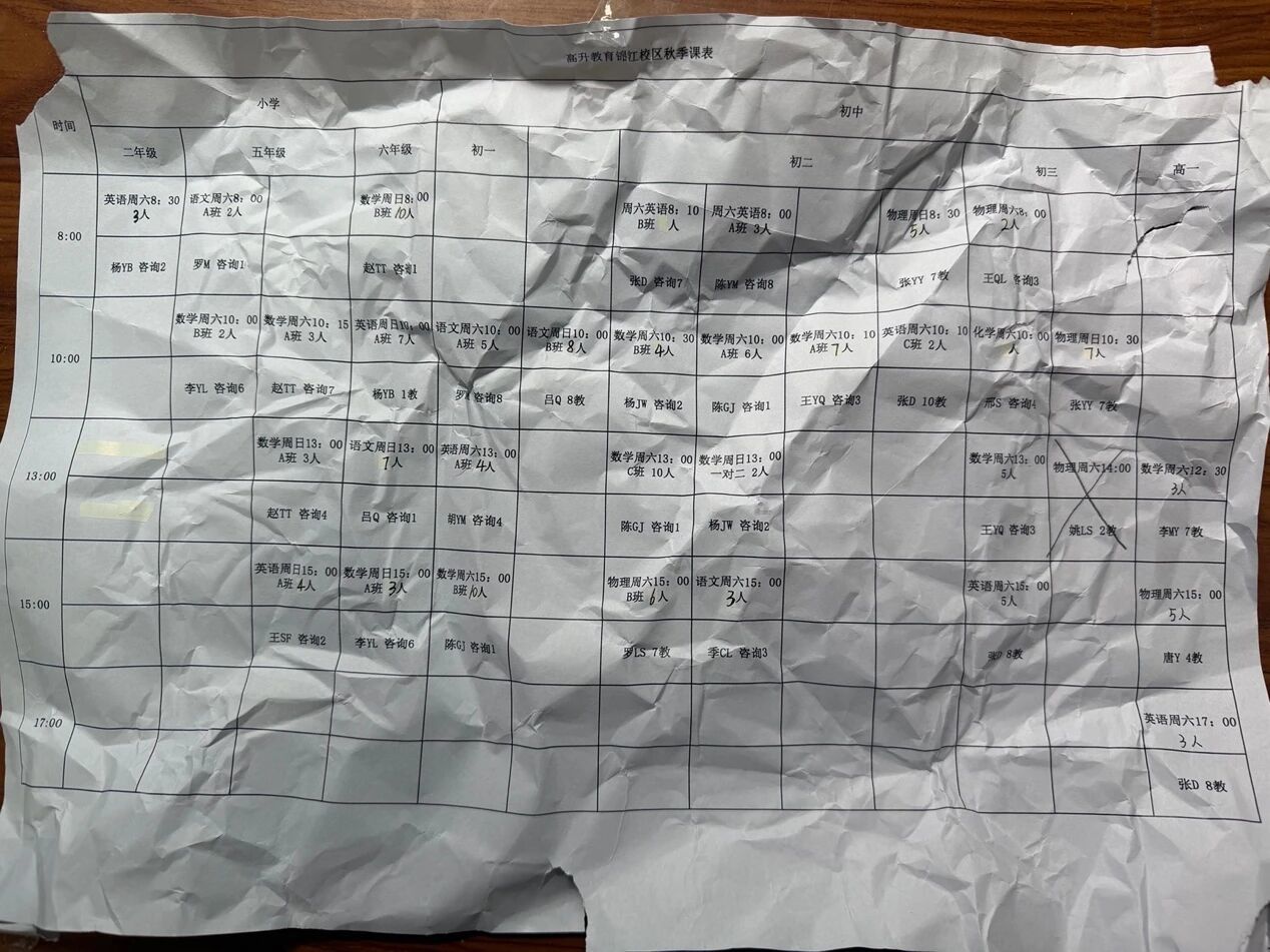 而在现场,当时虽无学生上课,但被揉成一团的秋季课表,上面清晰排列着小学和初中英语、语文、数学、物理、化学等学科课程的上课时间、地点和人数。同时,检查组还在现场发现有学科重难点的培优资料,电子黑板中存有物理课件……以上无一不是该机构(公司)在开展学科培训的痕迹。