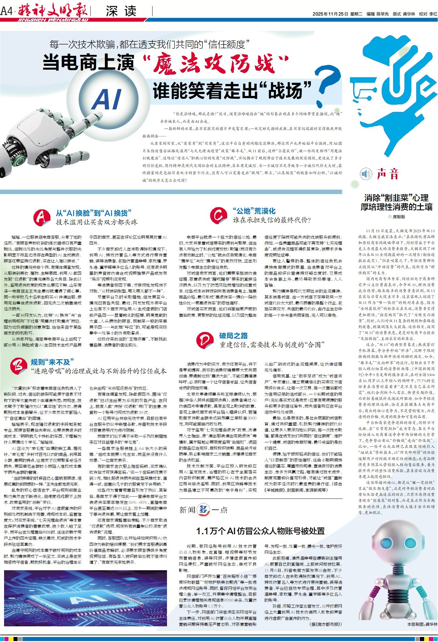 从卖家到买家,从“卖家秀”到“买家秀”,这边平台自身的问题还没解决,那边用户也开始钻平台漏洞,用AI图片来伪造售后证据或滥用“七天无理由退货”政策“薅羊毛”。双11前后,这种“尔虞我诈”,被一些网友称作“用魔法打败魔法”。这场让“老实人”胆战心惊的电商“攻防战”,不仅揭示了规则滞后于技术发展的现实困境,更造成了多方的信任危机。契约精神是现代文明社会的主流精神,其本质是诚信。当一方诚信不足导致另一方诚信代价太大时,最终损害的是包括买卖双方的整个行业,没有人可以笑着走出“战场”。那么,“以恶制恶”的链条如何打断,“以诚对诚”的秩序又怎么去巩固?