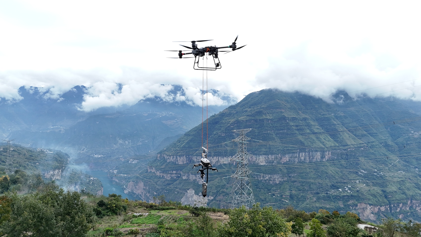 国网四川电力作业人员操控大型载重运载无人机飞抵检测点。王志奇 摄