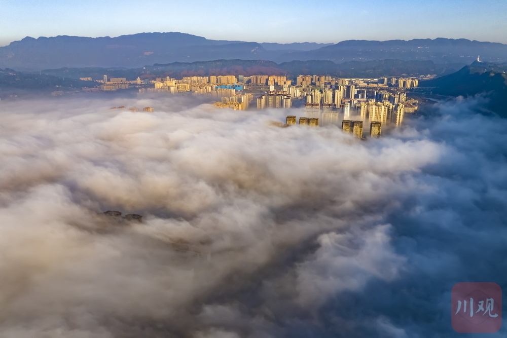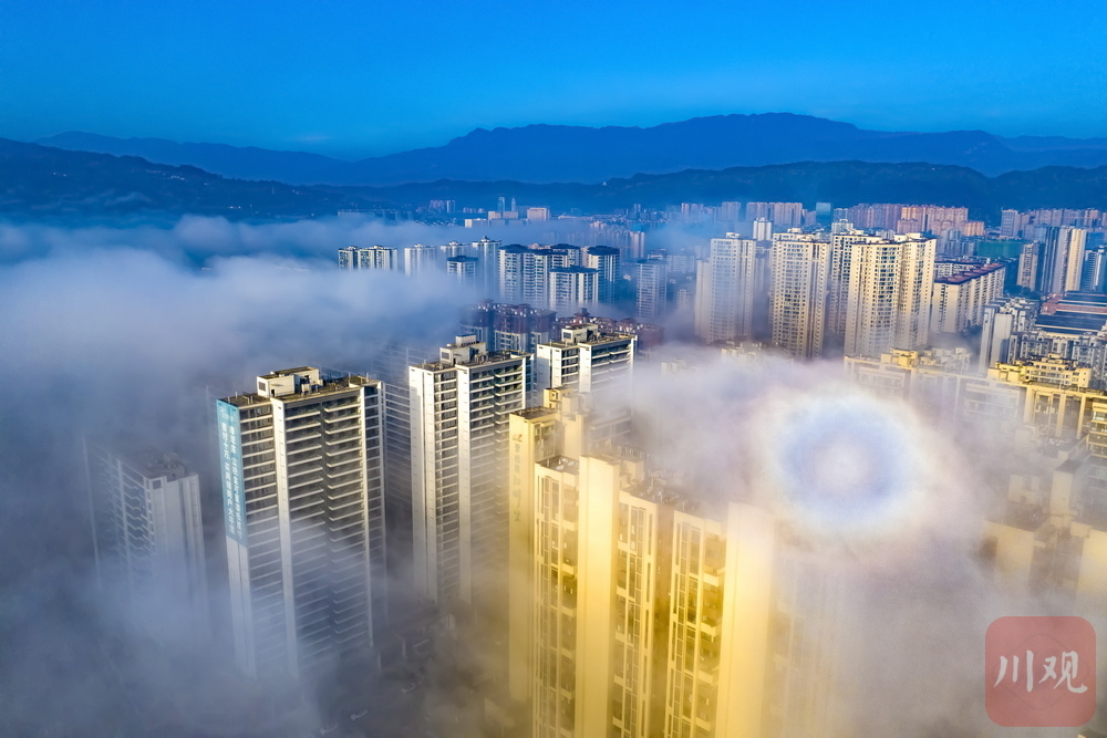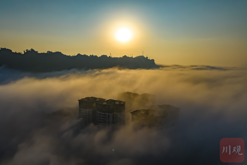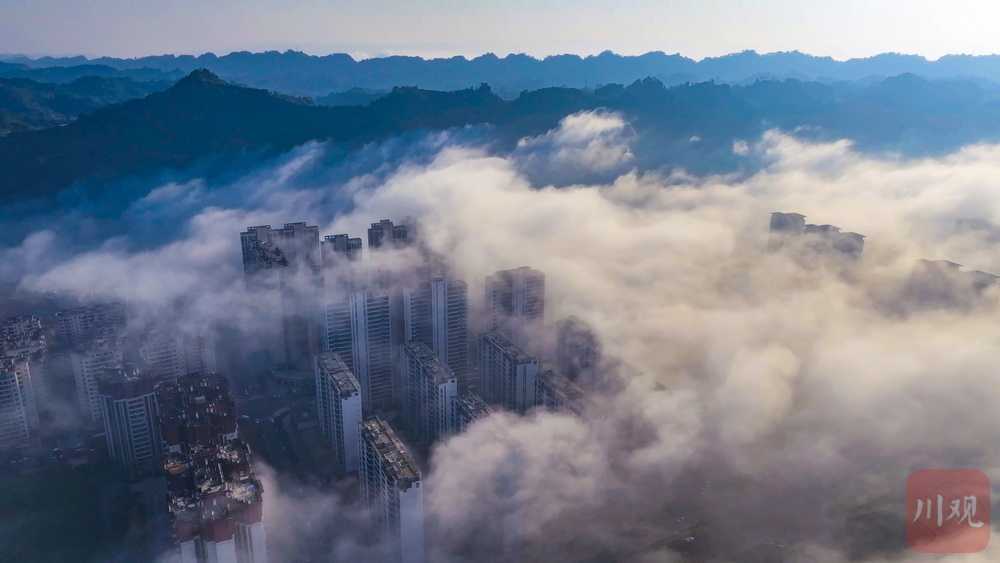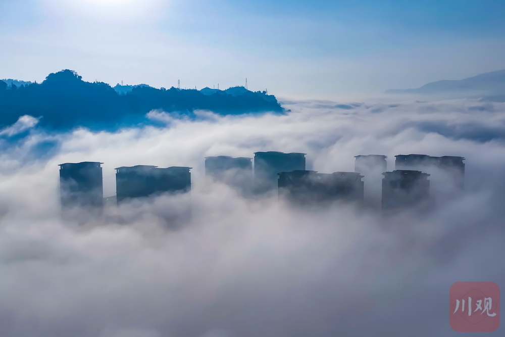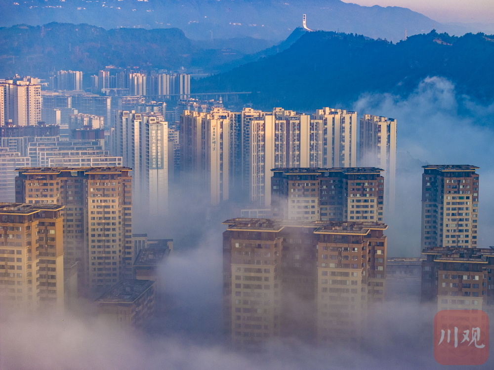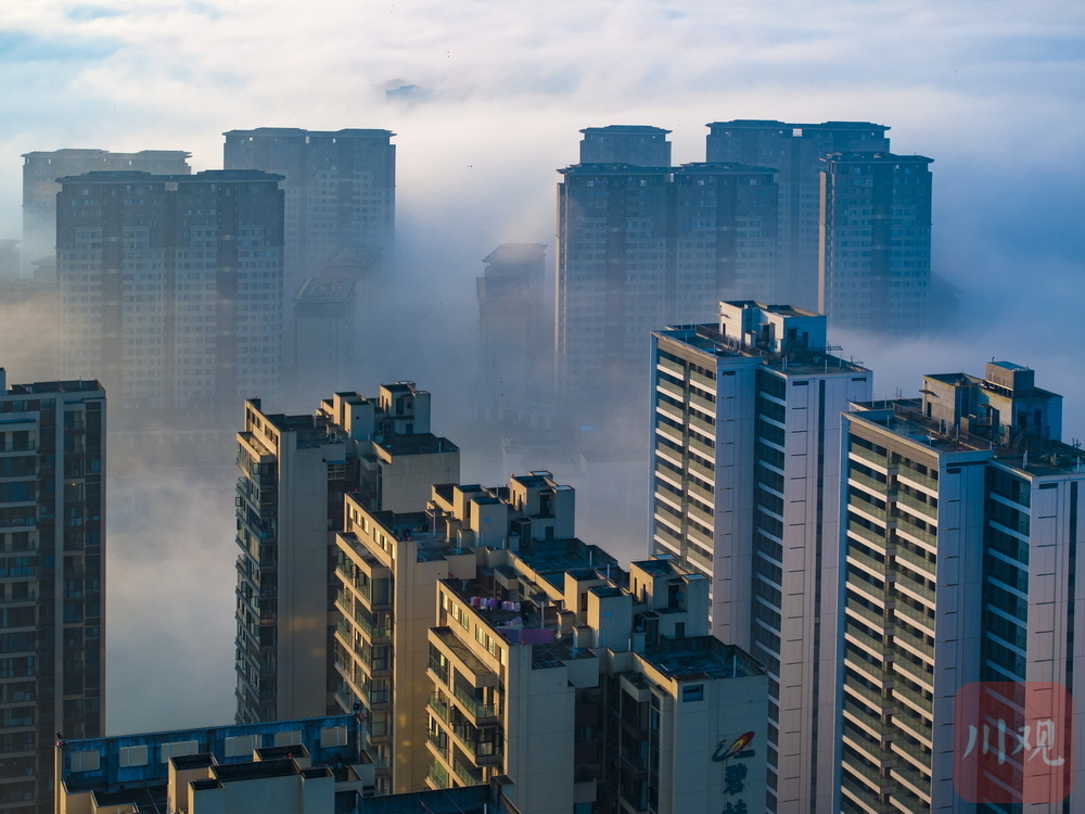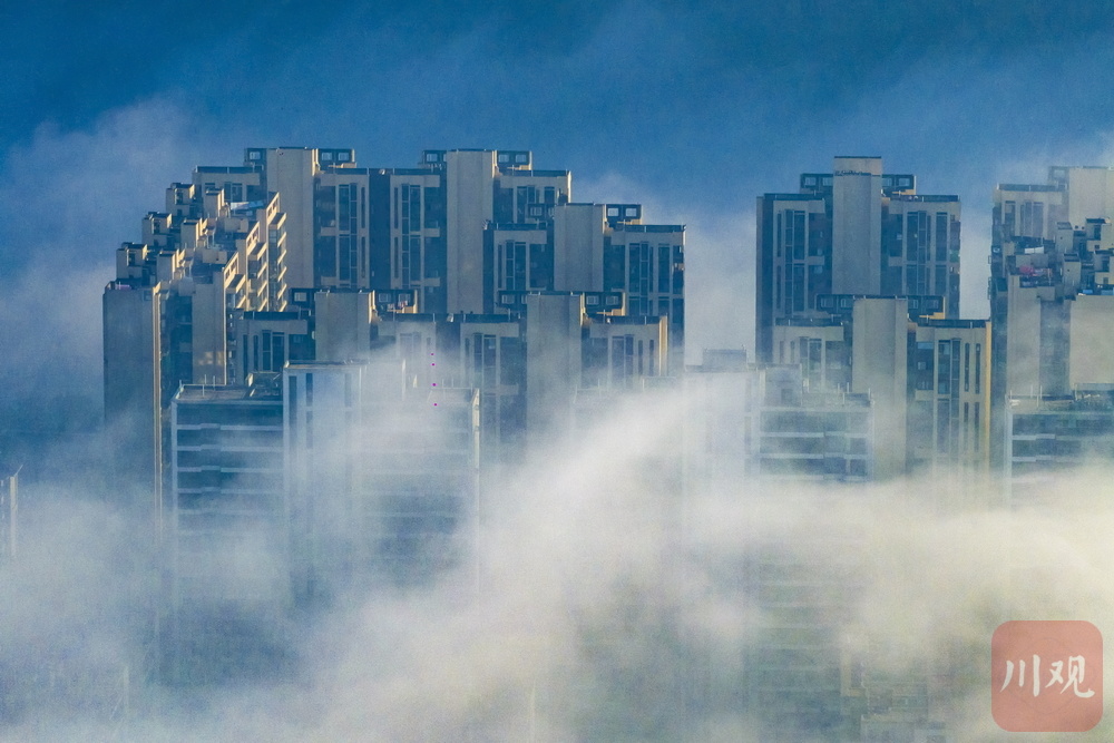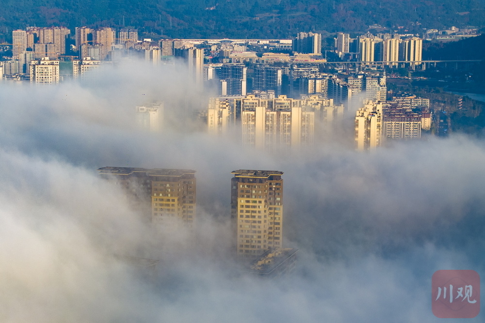 11月24日清晨,雅安市雨城区大兴、草坝等区域再现平流雾景观,云雾如轻纱漫卷,缠绕城市建筑群,高楼在雾气中若隐若现,与远处山峦相融,宛如空中楼阁,构成一幅梦幻画卷,尽显城市与自然交融的独特魅力 。