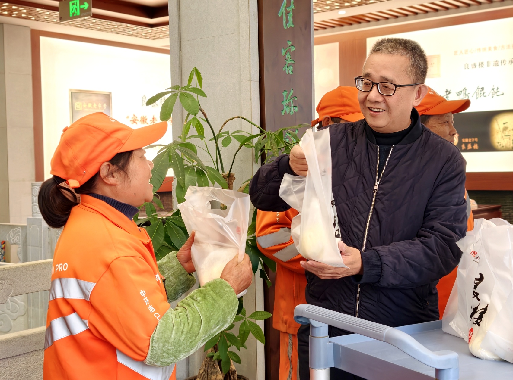 11月22日,小雪节气至,安徽省宣城市的街头寒意渐浓。下午四点半左右,身着橙色工装的环卫工人陆续走进位于敬亭路的一家酒店大厅,依次从一位老者手中接过一份份温热的鲜肉大包。“每天这个时间我们都来这里领包子,已经成了习惯。酒店的包子味道非常好,特意给我们留了这么多份。”一位环卫工人捧着刚领到的包子,眼角眉梢都漾着笑意。