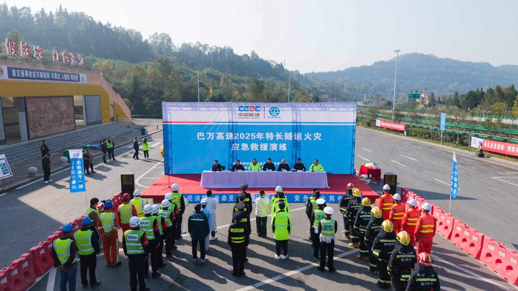 “各位司乘人员请注意,巴万向家营隧道内发生车辆追尾事故,伴有自燃风险,请隧道内司乘有序撤离……”近日,中国能建葛洲坝交投巴万高速特长隧道火灾突发事件应急救援演练在向家营隧道正式启动。