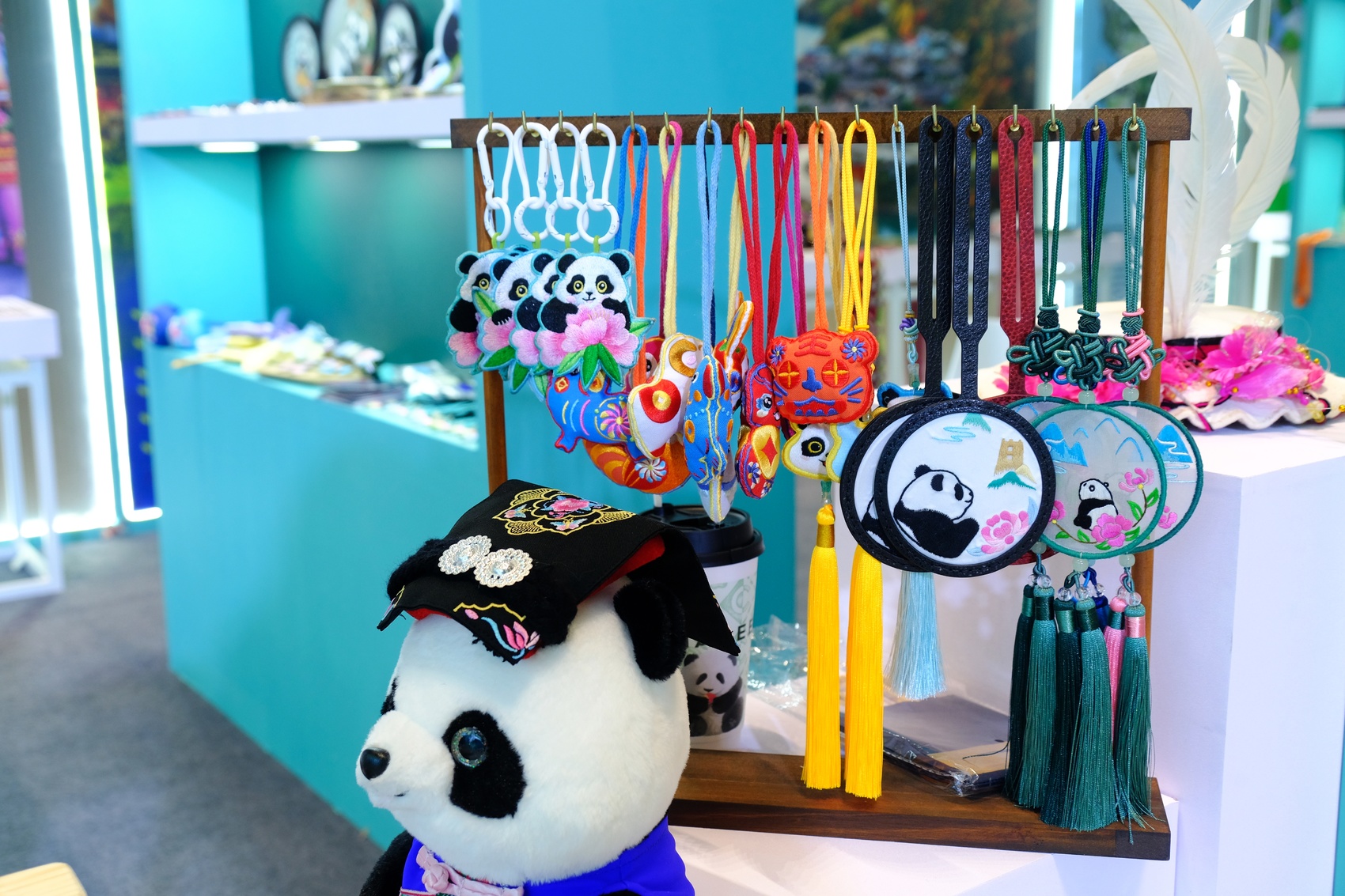 熊猫文创集市“青睐绵阳 熊猫有约”展位上,融合熊猫元素的羌绣双面绣挂件。(漆世平 摄)