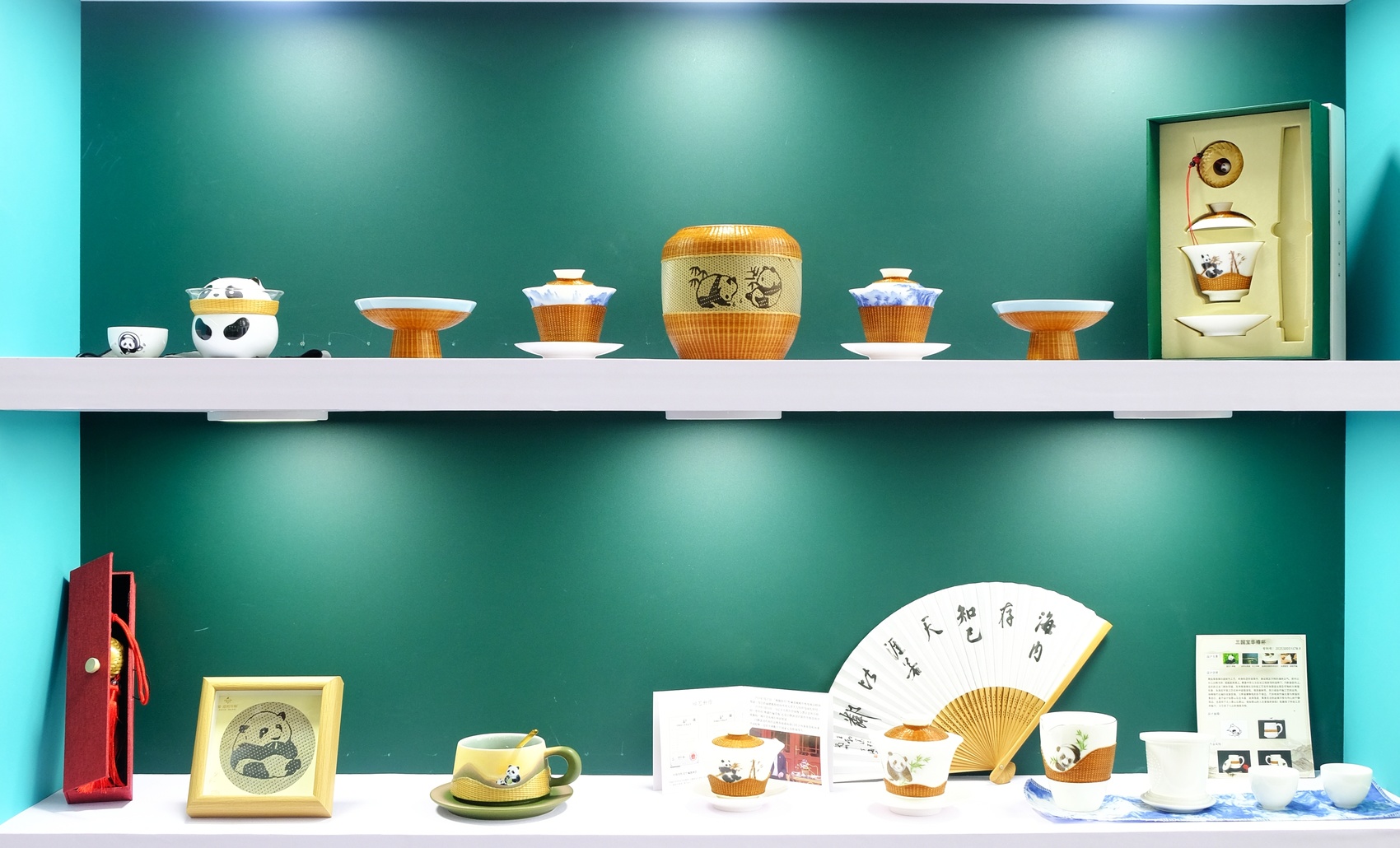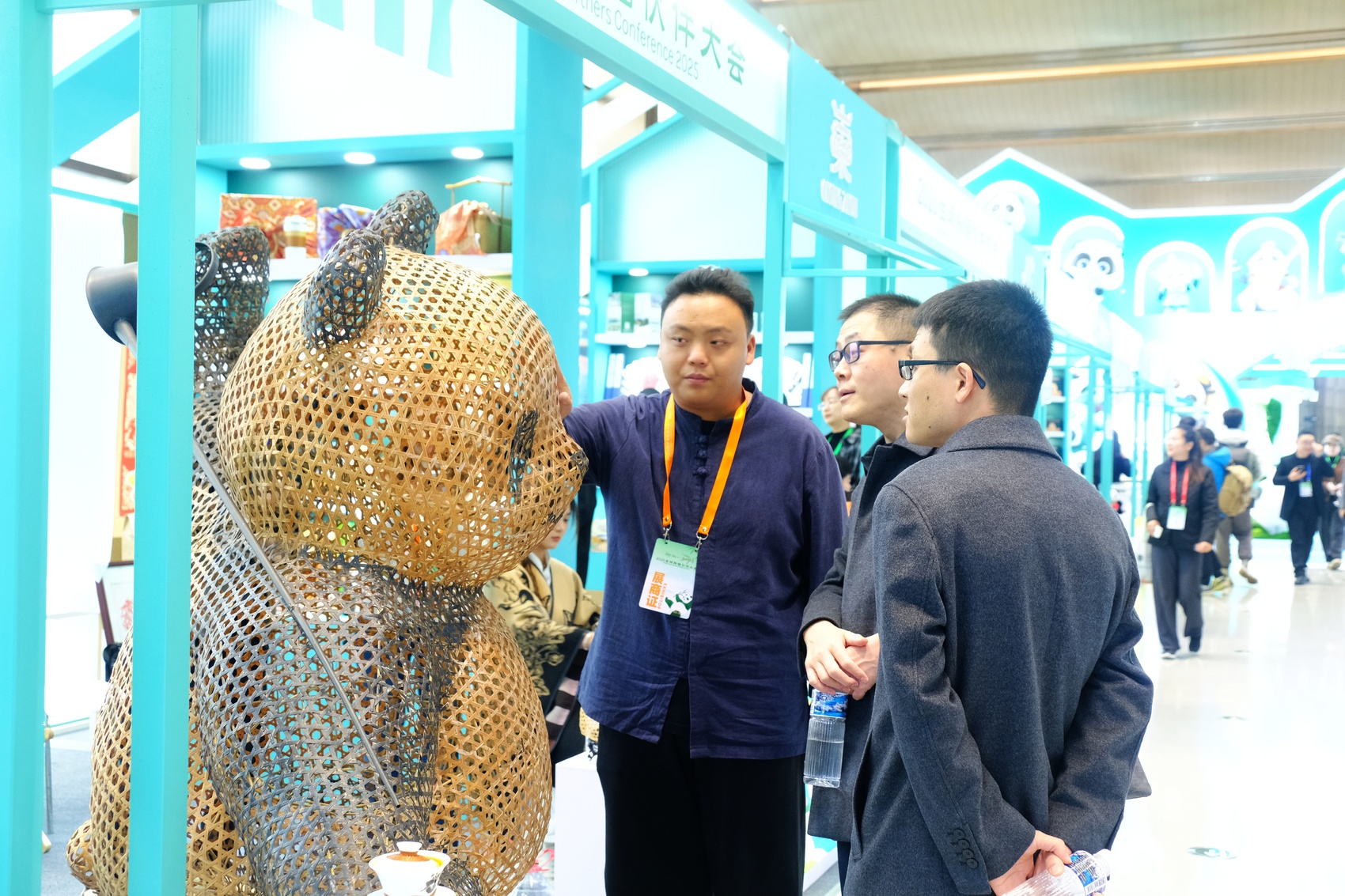 不远处的“蜀中之蜀,罨画崇州”展位前,1.6米高的竹编“功夫熊猫”演绎长嘴壶茶艺,引得游客驻足拍照。展位内,“熊猫抱竹”竹编盖碗、“熊猫竹编小胖杯”等文创产品琳琅满目,竹子的清香与熊猫的憨态相得益彰。