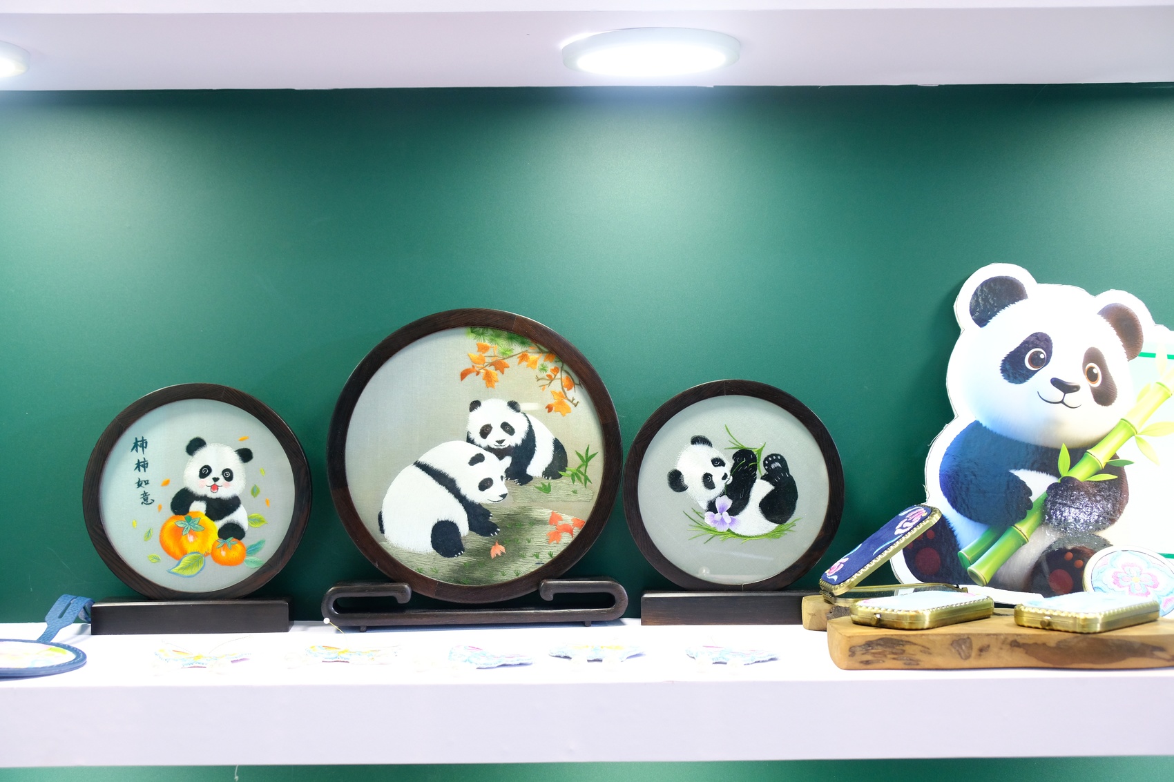 熊猫文创集市“青睐绵阳 熊猫有约”展位上,融合熊猫元素的羌绣作品。(漆世平 摄)