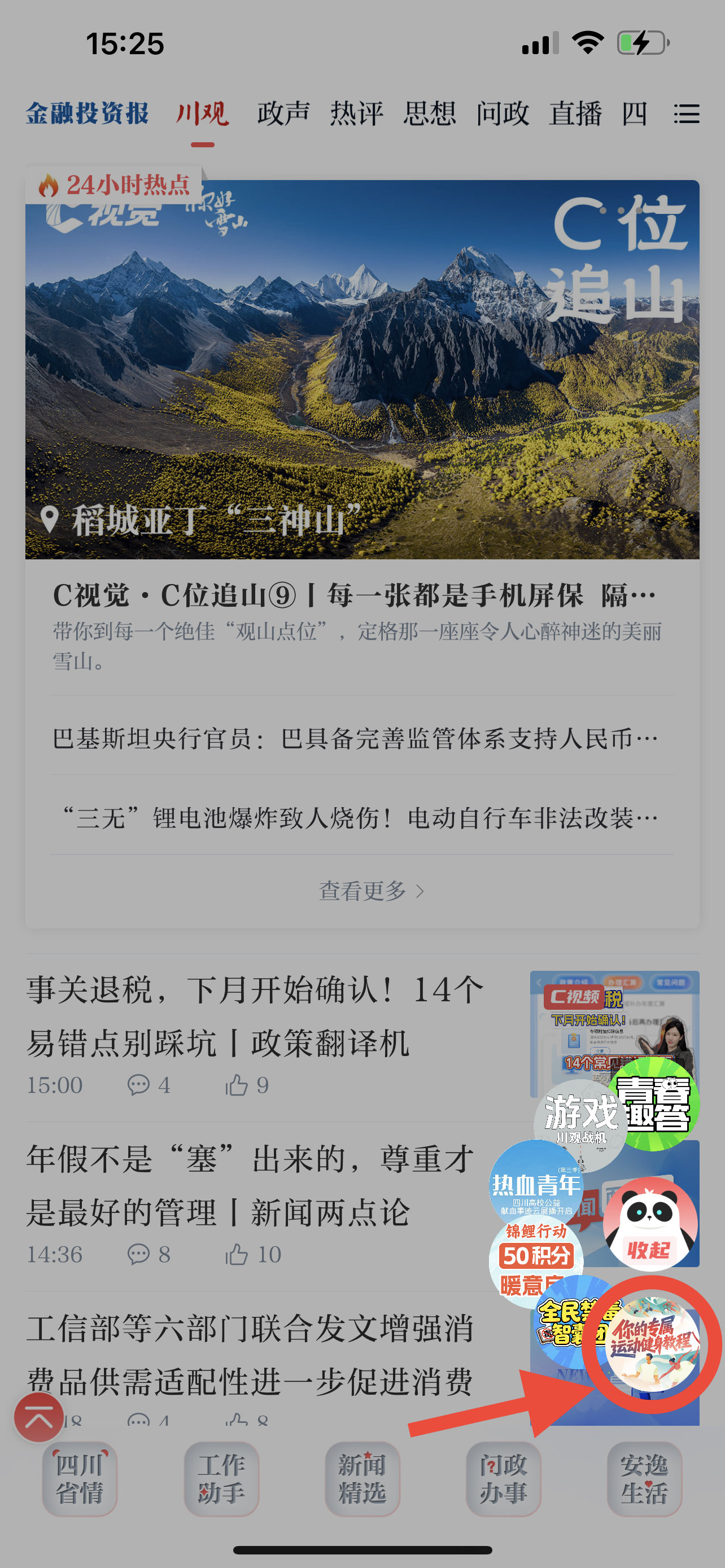 打开川观新闻App,首页右下角悬浮球选择“运动健身课程”按钮,点击即可进入课程。