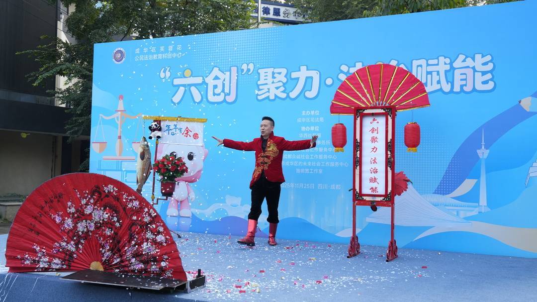 舞台上,原创节目精彩纷呈。《法治二人快板》将《民法典》条款编成明快唱词,法治魔术以“凭空变出‘六创聚力’标语” 的创意引爆全场。舞台下,心理咨询区的专家提供“法律+心理”双轨服务,并开放了10个免费咨询名额。直播打卡区的拍立得前,队伍排成长龙,居民手持“手拉手践行法治,心连心共建和谐”KT板拍照,让普法场景变身“网红打卡点”。“我们不是搞‘独角戏’,而是搭‘大舞台’,让更多主体成为法治传播的参与者。” 成华区司法局相关负责人表示。