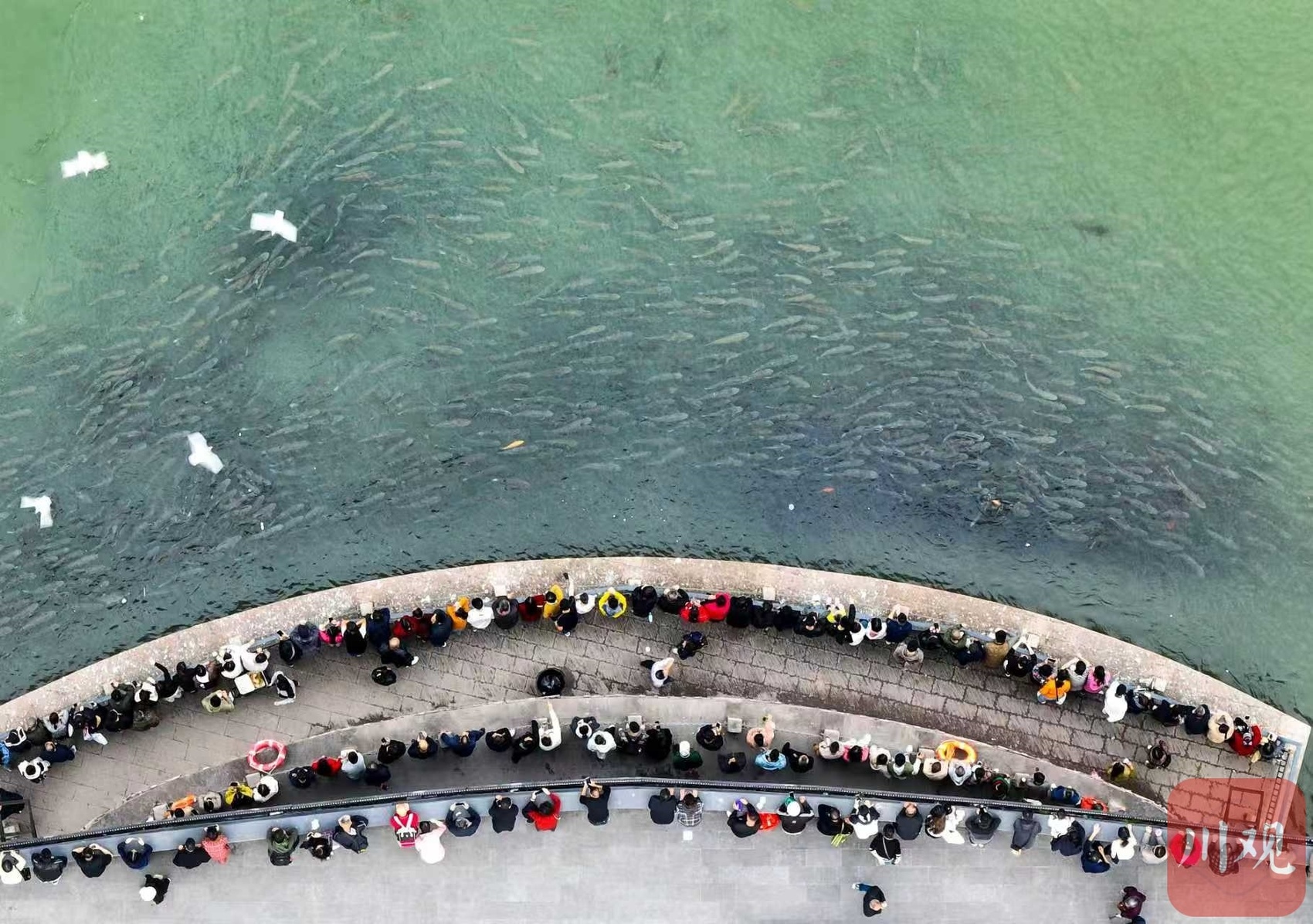 11月中旬的宜宾合江门,金色的阳光洒在江面上,数千尾野生鱼成群靠近岸边觅食,面对簇拥的人群毫不胆怯,引来此起彼伏的快门声与惊叹声。