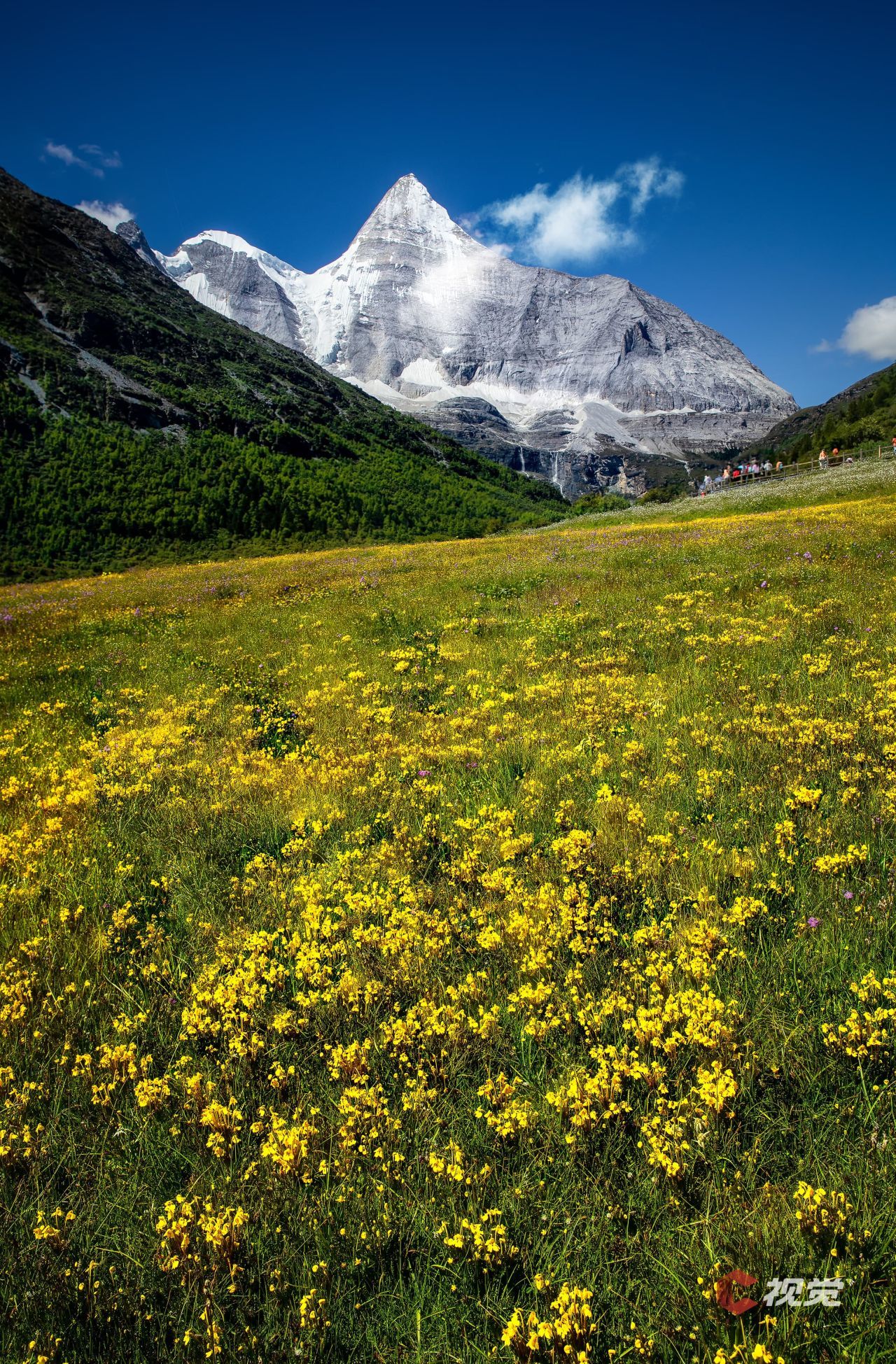 夏日繁花点缀着巍峨的央迈勇雪山,远处徒步观景的人们络绎不绝。C视觉签约摄影师 沈军