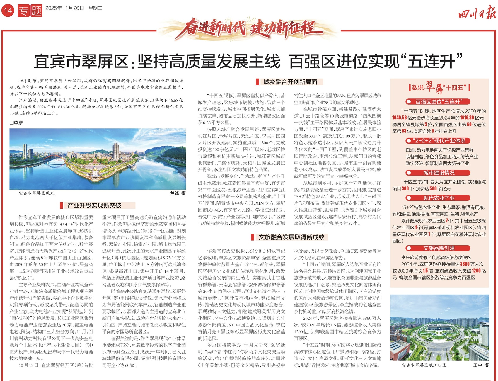 江水滔滔,映照奋斗足迹。“十四五”时期,翠屏区地区生产总值从2020年的1046.58亿元稳步增长至2024年的1616.30亿元,稳居全省县域第5位,全国百强区由第68位进位至第53位,连续5年排名上升。