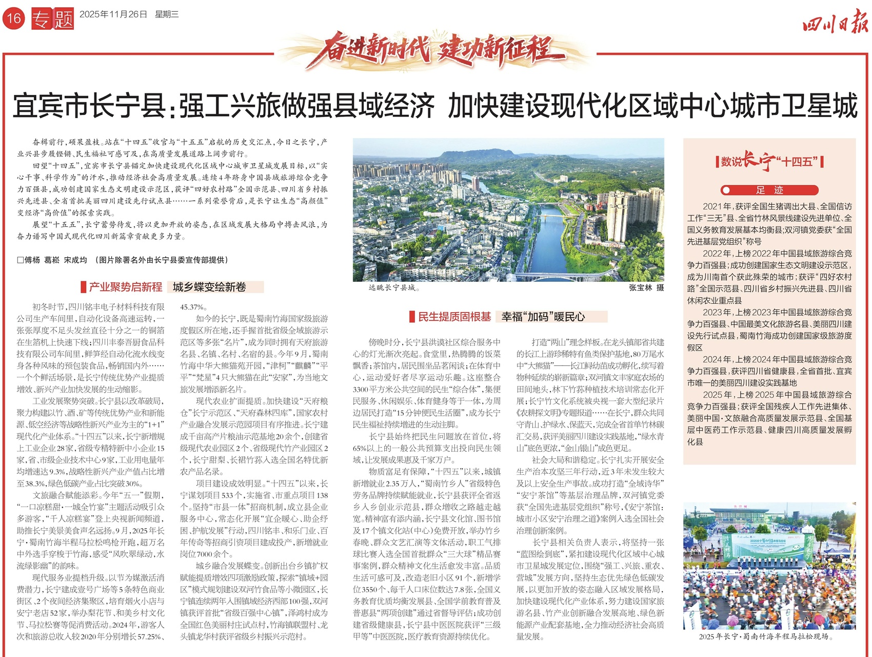 回望“十四五”,宜宾市长宁县锚定加快建设现代化区域中心城市卫星城发展目标,以“实心干事、科学作为”的汗水,推动经济社会高质量发展。连续4年跻身中国县域旅游综合竞争力百强县,成功创建国家生态文明建设示范区,获评“四好农村路”全国示范县、四川省乡村振兴先进县、全省首批美丽四川建设先行试点县……一系列荣誉背后,是长宁让生态“高颜值”变经济“高价值”的探索实践。
