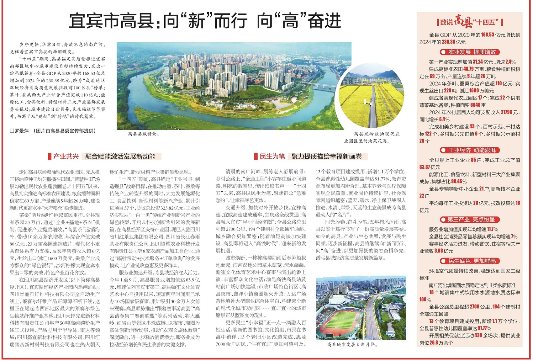 “十四五”期间,高县锚定高质量推进宜宾南部区域中心城市建设目标持续发力,交出一份亮眼答卷:全县GDP从2020年的168.53亿元增加到2024年的230.38亿元,跻身“成渝地区双城经济圈高质量发展指数前100区县”榜单;茶叶、蚕桑两大产业综合产值突破110亿元;能源化工、食品饮料、新型材料三大产业集群发展势头强劲;城市建设日新月异,民生福祉节节攀升,书写了从“追赶”到“跨越”的时代篇章。
